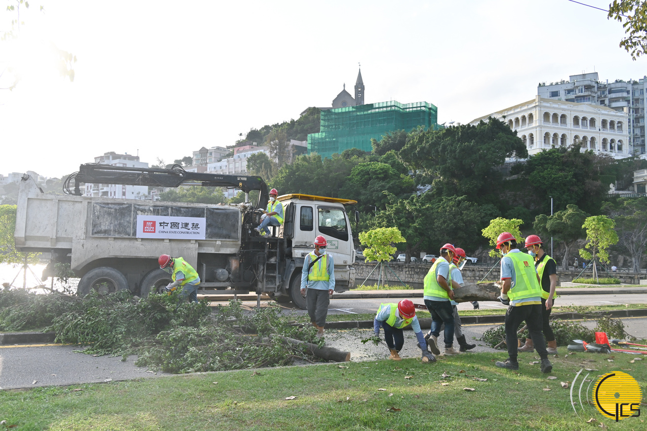 “水晶魚2022”颱風演習-治安警察局協調建築工程公司工程車及人員到場,協助清走塌樹,以恢復現場交通。