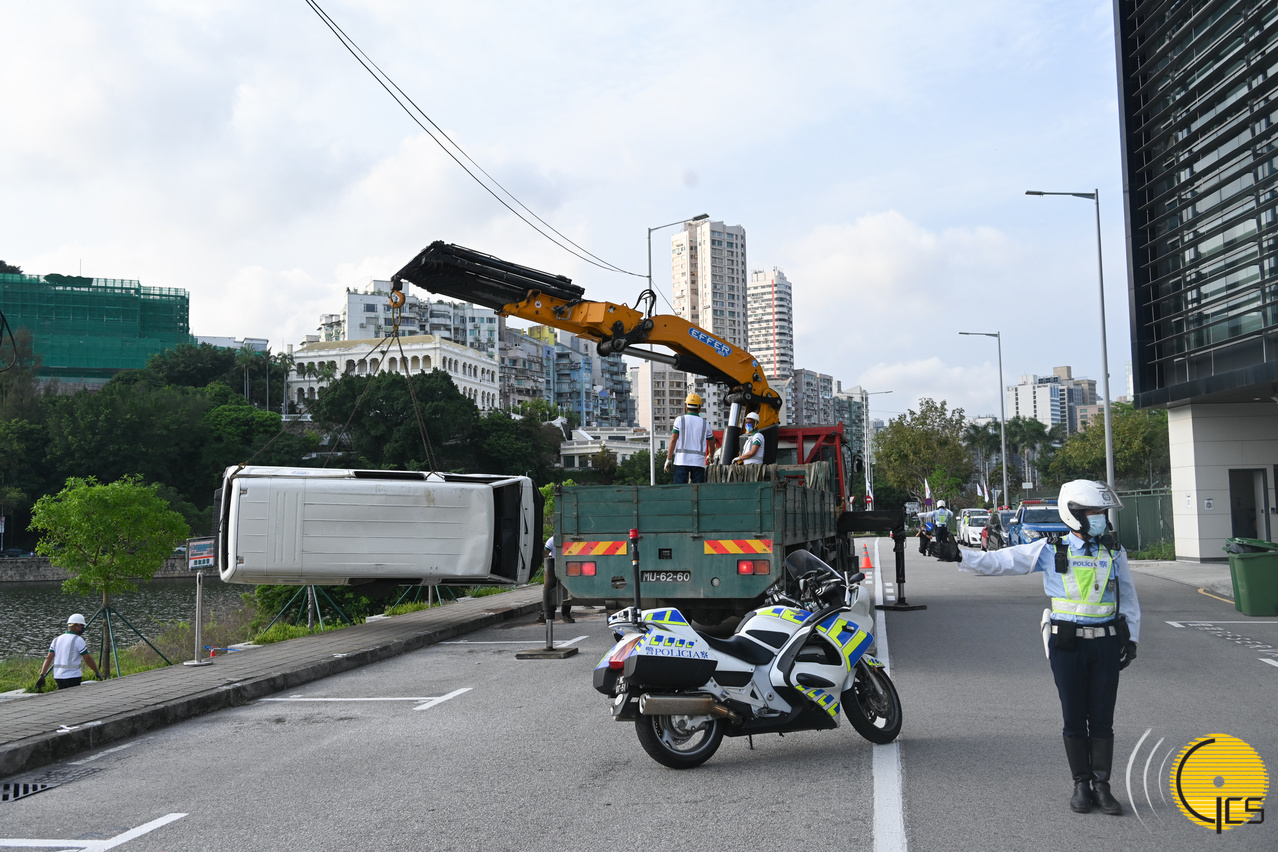 “水晶魚2022”颱風演習-治安警察局協調澳門建築機械工程商會派出大型吊車到場,將阻礙公共地方的車輛吊回路面。