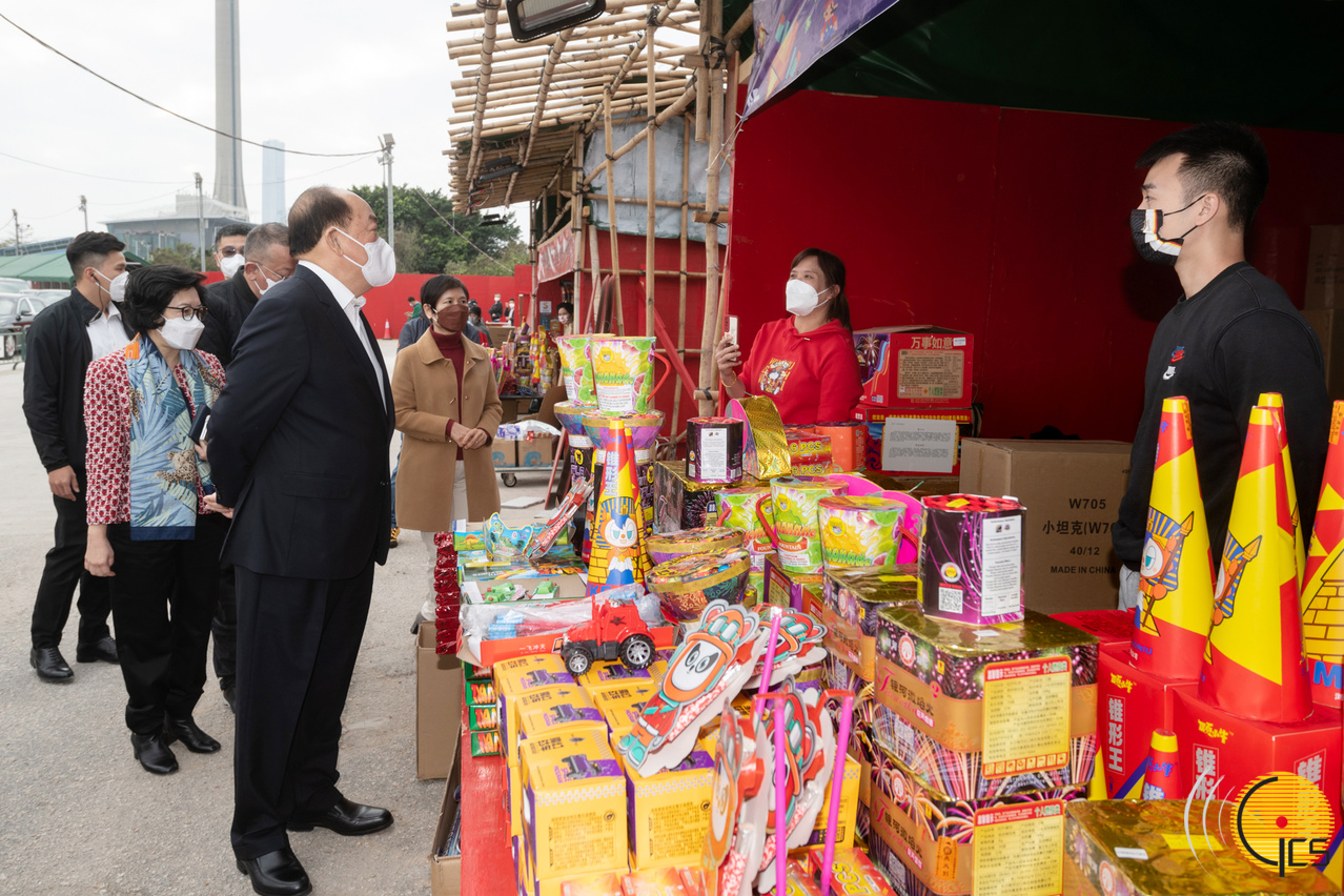 行政長官賀一誠與爆竹檔主親切交談,瞭解攤位入貨情況。
