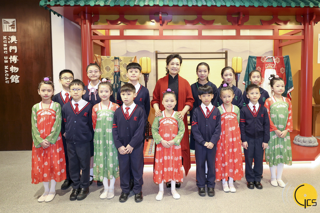12月19日上午,國家主席習近平夫人彭麗媛在澳門特別行政區行政長官賀一誠夫人鄭素貞陪同下,來到澳門博物館參觀。這是在博物館三層大堂,彭麗媛和剛剛參觀完展覽的小朋友們合影。(新華社圖片)