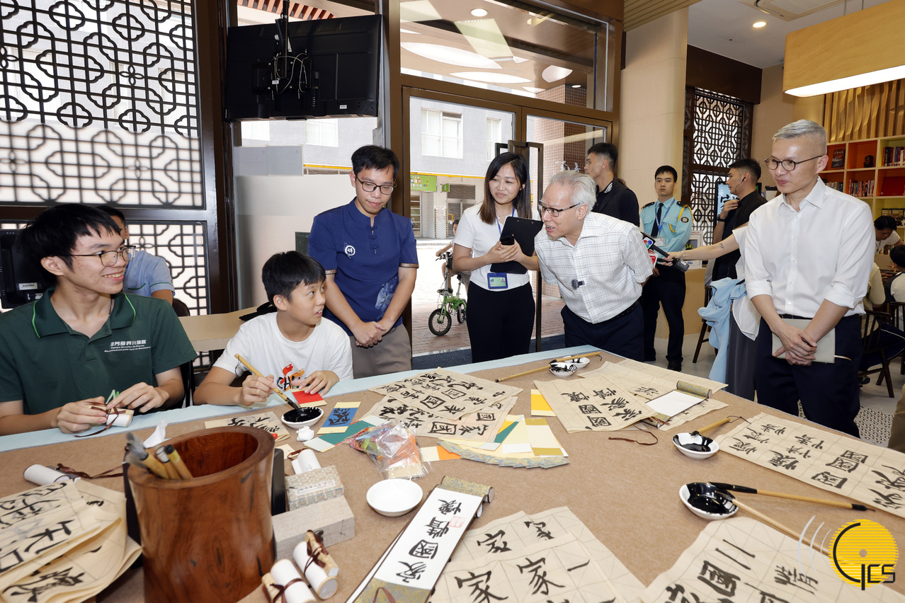 行政長官岑浩輝參觀位於青洲坊的家國情懷館,與使用館內服務的小學生親切互動。