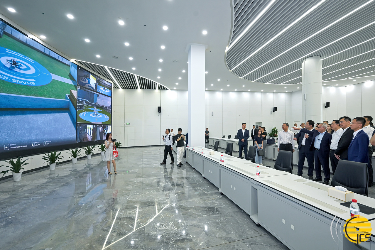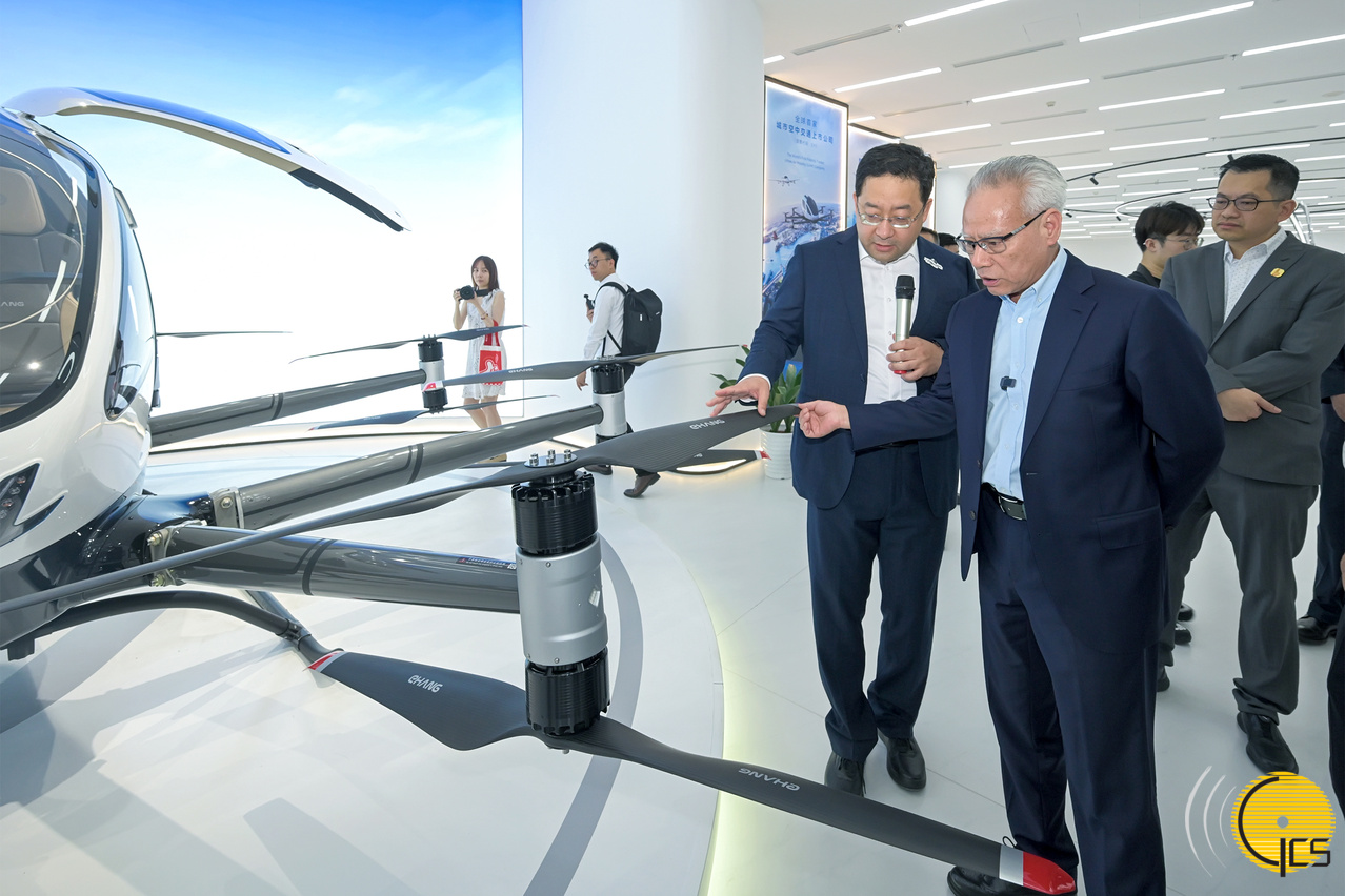 行政長官岑浩輝在廣州考察一家城市空中交通科技企業。