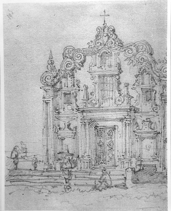 從其畫作中可見,當時教堂的立面頂部略呈三角形,邊上飾有多組S型帶螺旋紋的巴洛克風格卷渦形簷飾,立面中央上部設有拱形壁龕,其兩側設有拱窗,壁龕下開有3個矩形窗,均帶有巴洛克飾線,其中位於中央的窗戶最大。其下是入口大門及兩旁側窗,門窗框均採用花崗石砌築,帶巴洛克風格,入口兩側還飾有兩對塔司干式雙柱。