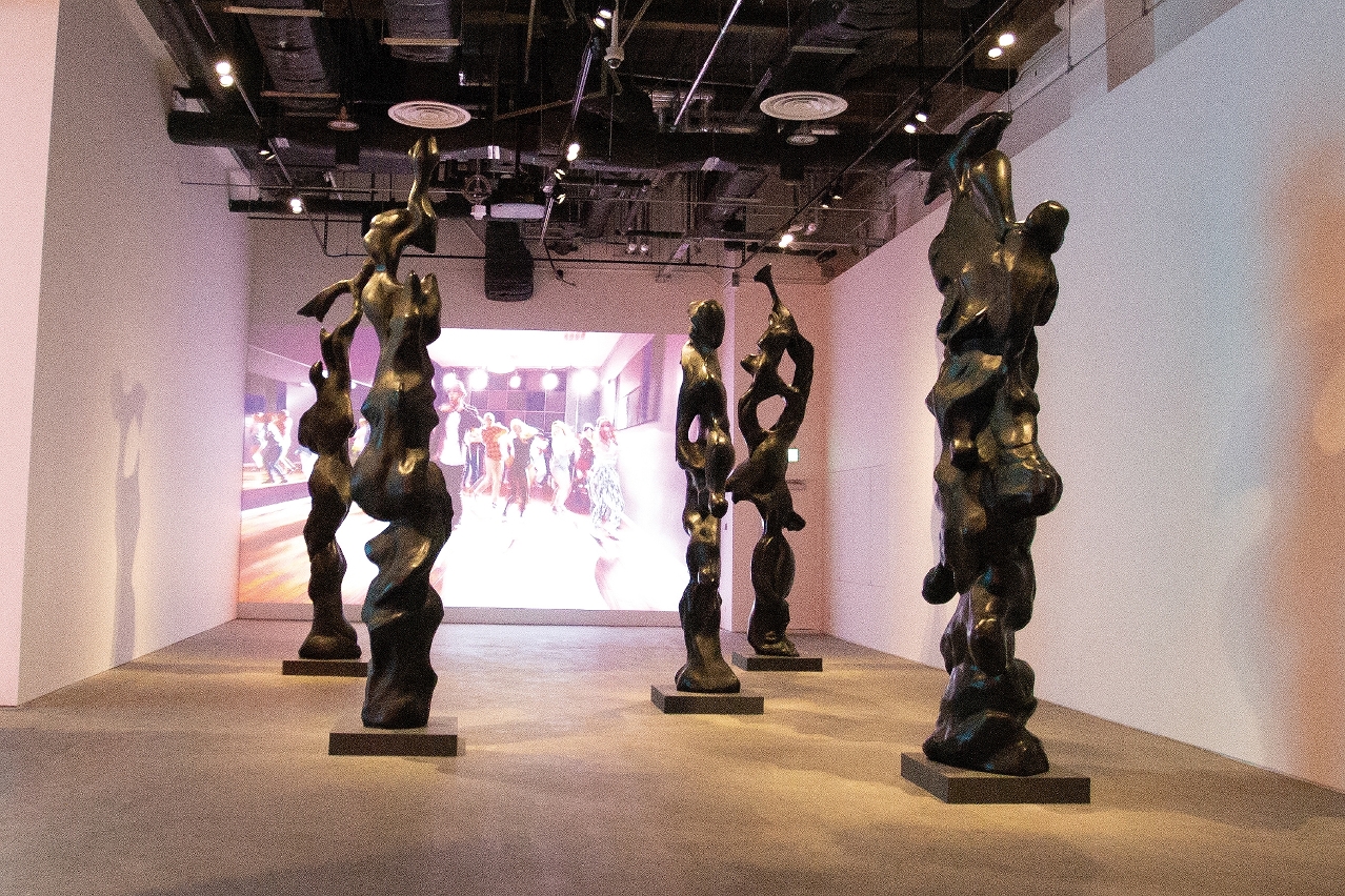 隔壁展區為美國藝術家赫伯.亞柏特(Herb Alpert)的代表作《精神圖騰》系列,5支巨如豐碑的銅雕,立於動感十足的投射影像前,在榮獲格林美音樂大獎曲目《Puttin' on the Ritz》襯托下,為參觀者帶來視覺及聽覺的多重感官體驗。