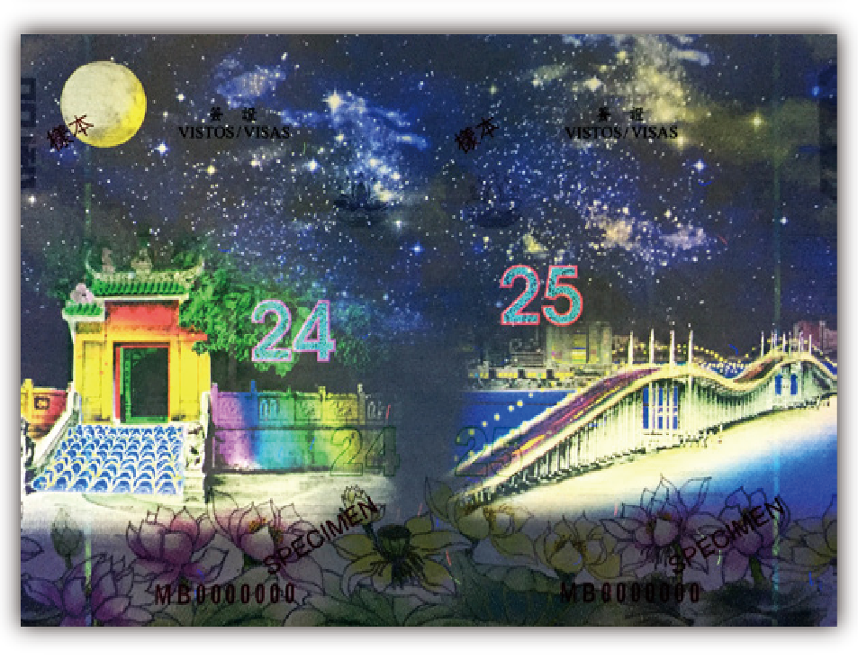相比於證件外觀的統一,證件內頁就顯得各有不同,亦見證了防偽特徵的演變。第一代旅行證件內頁,用色較為單調,設計簡樸。到了第二代旅行證件,除加入多項防偽特徵,還於證件內頁增添了很多澳門的特色建築,包括東望洋燈塔、媽閣廟、大三巴牌坊和三條大橋,在內頁底端還有荷花及長城圖案。歐陽瑜指出,選取這些建築圖案作為內頁襯底,可反映澳門的歷史,有助向全球推廣澳門。至於即將推出的特區旅行證件(2019版),會在原有的設計意念下,利用現今最先進的防偽技術,製作出更為安全的旅行證件,如運用「雕塑描畫」的方式印刷,使圖案的線條不再銳利,更多了一份柔和感,呈現出像中國水墨畫一樣的效果。