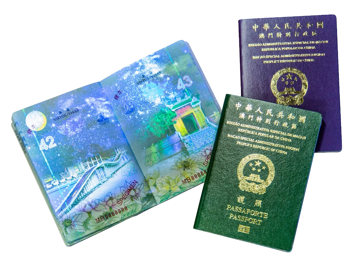 凹凸防偽圖案:澳門特區區徽、蓮花圖案及「PASSPORT」 (在護照上)或「TRAVEL PERMIT」(在旅行證上)字樣具有凹凸手感。