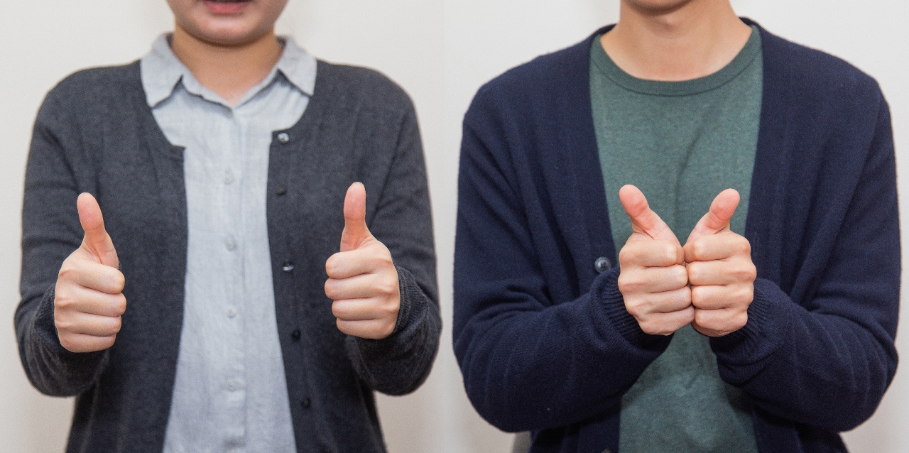 手語「朋友」:雙手舉起拇指,由外而內互碰,表示友好。