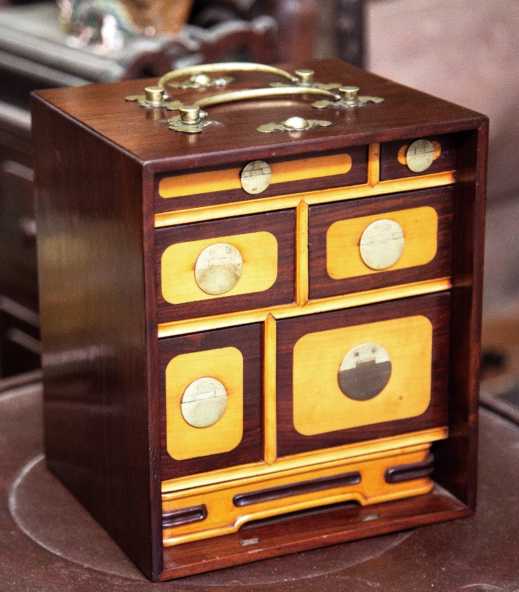 殷少國根據其設計推斷,這首飾盒出於清代:紅黃兩色配比鮮明、木材紋理清晰、黃銅配件精美,整體設計樣式,都帶着華美而不落俗套的時代特色。