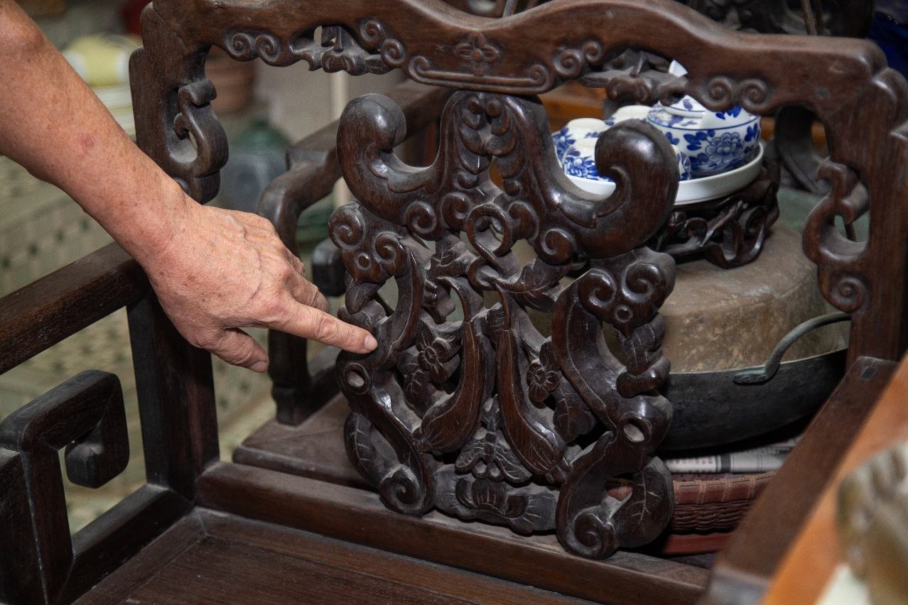 說起古董傢俬,殷少國便滔滔不絕。他說,每張木質凳椅都有自己的故事,從木材、色澤、造型、花樣設計便可追蹤其生產時期。比如清朝年代的木椅,以酸枝為主,其木質紋理清晰、色澤莊重沉穩;椅腳呈直口、整體造型渾厚;椅背的浮雕及鏤花則有如意、龍鳳等象徵吉祥華麗的元素。