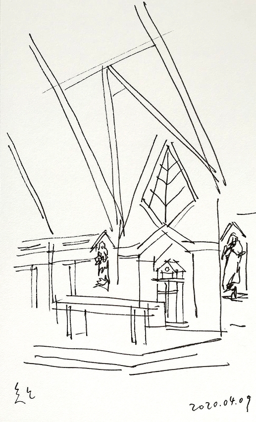作為結構的斜樑在教堂外直接插入地面,斜樑除了是結構元素,亦成為屋頂的戶外引水管,將斜屋頂的雨水引導至地面的排水槽。據夏剛志兒子憶述,其父以斜屋頂設計該教堂,目的是避免雨水的聲音干擾教堂內部的寧靜。小教堂的斜樑設計,確實非常「多功能」與「獨創」。