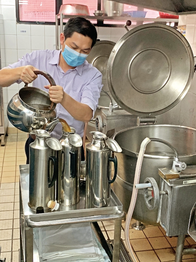 要配製足夠全院員工飲用的涼茶,工作量不小。李劍恒介紹,一般來說,清熱解毒類的藥物(如醫院的涼茶處方),單人份量只要煎煮20至30分鐘即可,但要製作可供全院1,000人飲用的涼茶,便要請膳食科協助煎煮。「為了保證藥材煎煮透徹,要預先浸泡藥材半小時才開始煎製,整個過程需要約一個半小時,其間還要不斷攪拌,避免煎煮糊底。為了方便飲用和儲存,涼茶煎煮好後會通過真空包裝,成品可以存放一個星期不變質。」