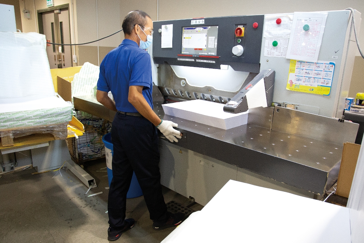 為了更好地保障員工的職業安全,印務局還配置了紙堆升降台。現時廠房內的員工不再需要從事人力搬運,通過操作紙堆升降台,就可將紙張或半製成品升降至與裁切台相同的高度,再進行裁紙的工序,減少員工的體能消耗及腰肌勞損。