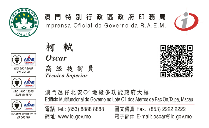 一個具有近120年歷史的公共部門,要在市場中繼續煥發新的光彩,陳日鴻認為,印務局的未來發展離不開資訊科技的應用。「一直以來,印務局借助科技的力量大膽嘗試,與時俱進。從以往的被動接單逐漸變為『主動出擊』,通過『人無我有』的特色技術與服務,提升使用者的滿意度。例如為公共部門印製的個人名片,不是單純利用機器印刷就完成任務,而是通過員工主動思考與鑽研設計,我們在名片上增加了可提供官方認證的二維碼(QR Code),並同步為參與的公共部門建立了所屬的名片管理系統,用戶只須掃瞄二維碼便能輕鬆獲取詳細的名片訊息。」