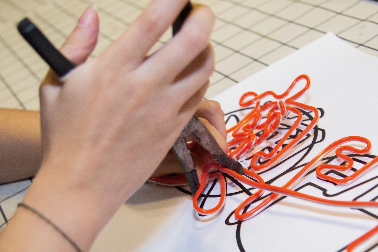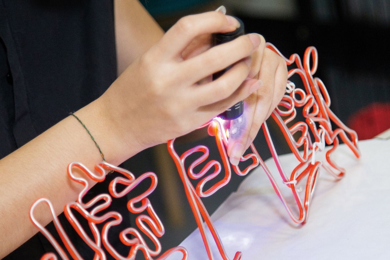 相比起製作傳統霓虹招牌要加熱彎曲玻璃管、連接電極,再清除玻璃管內雜質、排出空氣並添加氣體等等專業工序,冷光燈牌的製法門檻較低,但Ruby指出,要把成品做得好看,仍須花上不少心思:「在製作燈牌前,需要先打印設計圖,再用線照着圖紙繞出造型,較為特別的是,冷光燈牌須『一氣呵成』,即用一條線完成整個圖案或字樣。因此,在整個製作過程中,要不斷思考如何用線把分離部份自然地串連起來,這十分考驗製作者的動手能力、美感、排線佈局的技巧。」除了繞線,冷光燈還須經鐵線固定、UV膠黏合等程序,完成一個尺寸約為30厘米的招牌,往往需要2至3小時。雖然耗時良久,但帶着滿滿心意製作出來的手作品,比起量產商品,更多添一份温暖。她說:「參加課程的學員,涵蓋不同年齡和性別,是一項任何人士都能參與的手作活動。」