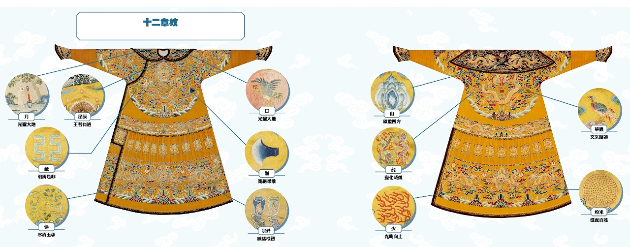 「十二章紋」包括:日、月、星辰、山、龍、華蟲、宗彝、藻、火、粉米、黼、黻。其寓意着皇帝如日月星辰一般普照大地;如高山讓人敬仰、鎮重四方;如龍隨機應變,興雲作雨;如華蟲之彩、明德昭著;如宗彝知深淺之智、不忘先祖;如藻水中滌蕩、清爽潔淨;如火蒸蒸日上;如粉米可以養人;如黼(斧)切割果斷;如黻(弓形)君臣相濟、見善背惡般至善至美的帝德,和至高無上的權利。