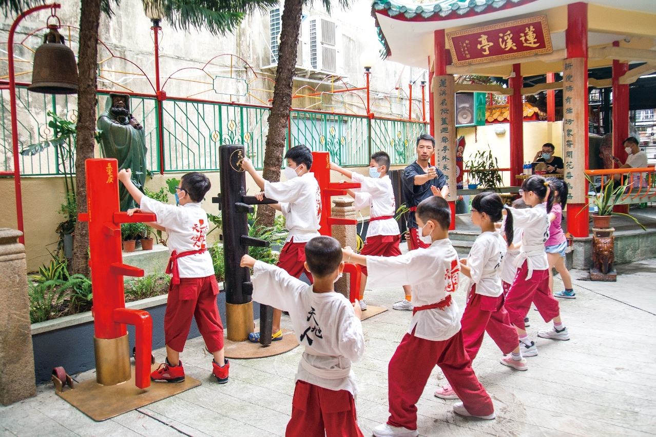 「噔、噔噔、噔」一下下鏗鏘有力、肉體與木樁的踫撞聲,響徹於新橋花園內。尋聲望去,身穿整齊功夫衫的學徒,正依從師傅的指導,對着鮮紅色的木人樁,施展剛勁的套路,在方寸之地,拳腳之間,顯現尚武精神。這,就是「紅船木人樁」!