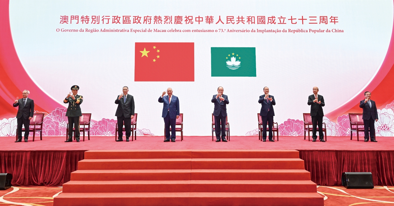 升旗儀式後,特區政府在中國與葡語國家商貿合作服務平台綜合體舉行慶祝中華人民共和國成立73周年酒會,全國政協副主席何厚鏵、中央人民政府駐澳門特區聯絡辦公室主任鄭新聰、崔世安先生、外交部駐澳門特派員公署特派員劉顯法、解放軍駐澳部隊政治委員孫文舉、立法會主席高開賢、終審法院院長岑浩輝、行政會委員、立法會議員、特區政府官員、澳區人大代表、政協委員及各界人士等逾1,100人出席。