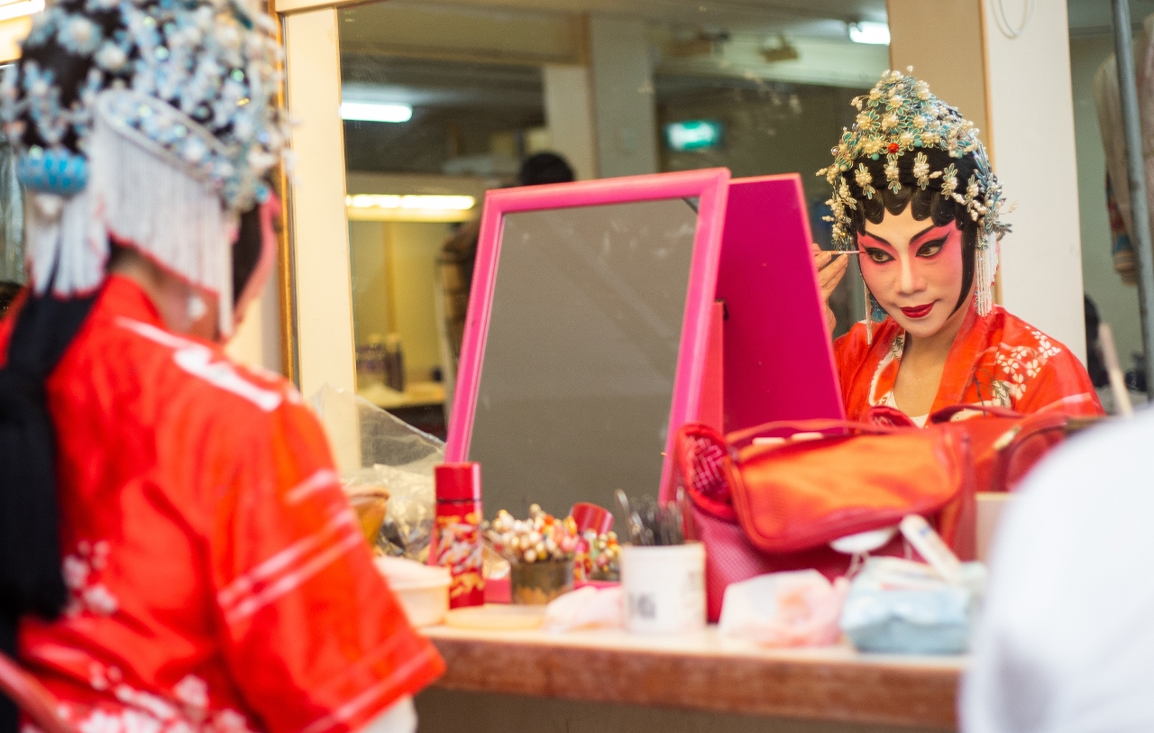 踏台板逾40年的國家一級粵劇演員曾慧,受訪時坐在永樂戲院後台化妝室一角,身穿水衣紅袍,正為演出準備「裝身」,她的一舉一動,優雅自然,讓人留下深刻印象。
