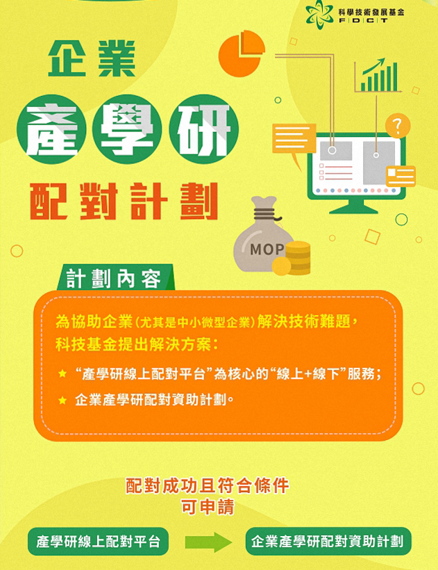 「產學研配對平台」的推出,是科技基金轉型發展的重要措施。葉桂林指出,現在澳門的科研成果仍然以學研機構團隊為主導,但提升科技創新支撐力,以推動澳門經濟適度多元發展,應以科技企業主導,才能實現實際效益最大化,因此,「產學研配對平台」及「產學研配對計劃」於2021年下半年應運而生。「產學研中有三個要點,第一就是科技企業提出需求;第二就是供給,學研機構利用現有的科研成果及能力,有意願去合作解決科技企業技術問題的開發;第三則是風險問題,企業和科研機構如有合作意願,初次合作難免有風險及信心的問題出現,透過科學技術發展基金『資助+服務』的形式,可以更精準及有效地為學研機構及科技企業提供協助。」直至目前,共有194項科研成果發佈在「產學研配對平台」,共成功配對25項。