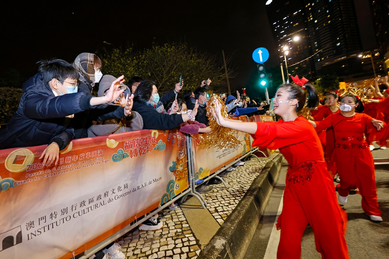 大年初一,寓意生龍活虎的238米大金龍,在瑞獅的伴隨下穿梭澳門多個地點,向觀眾呈獻龍獅表演。財神爺、金童玉女、福祿壽、兔生肖、澳門旅遊吉祥物「麥麥」等亦會在澳門各區出現,向遊人拜年及派發「金元寶」。