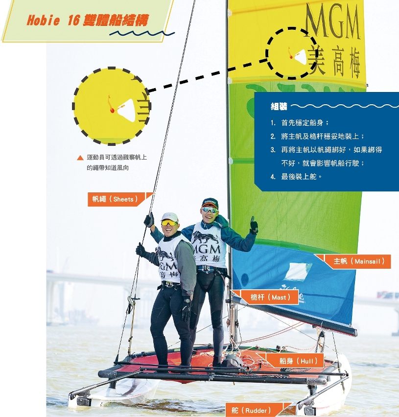 帆船種類繁多,除了常見單人、雙人帆船外,還有需十人以上才能操控的大型帆船。黎榮發今次參加的Hobie 16雙體船,其特點在於船體桅杆較長,主帆面積大,受風接觸面積亦隨之增加,加上兩個不對稱的船體可承受較大風浪,因而船速很高。「雙體船没有定水板,只靠舵來控制,十分考驗二人的默契和配合。」