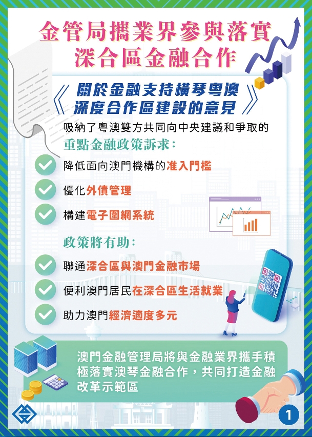 陳守信認為,《意見》明確了未來橫琴粵澳深度合作區(下稱「深合區」)金融發展方向,將進一步推動澳琴金融市場的聯動發展。特區政府將聯同廣東省政府,貫徹落實《意見》相關政策,共同研究出台實施細則。其中,金管局與深合區金融發展局,已經建立了跨境金融工作組,就債券市場、私募基金、融資租賃,以及在深合區建立粵港澳大灣區保險服務中心等議題保持溝通。相信隨着《意見》的實施,兩地金融部門將攜手推動業界用好中央給予的支持政策,促進澳琴金融產業的聯動創新發展。