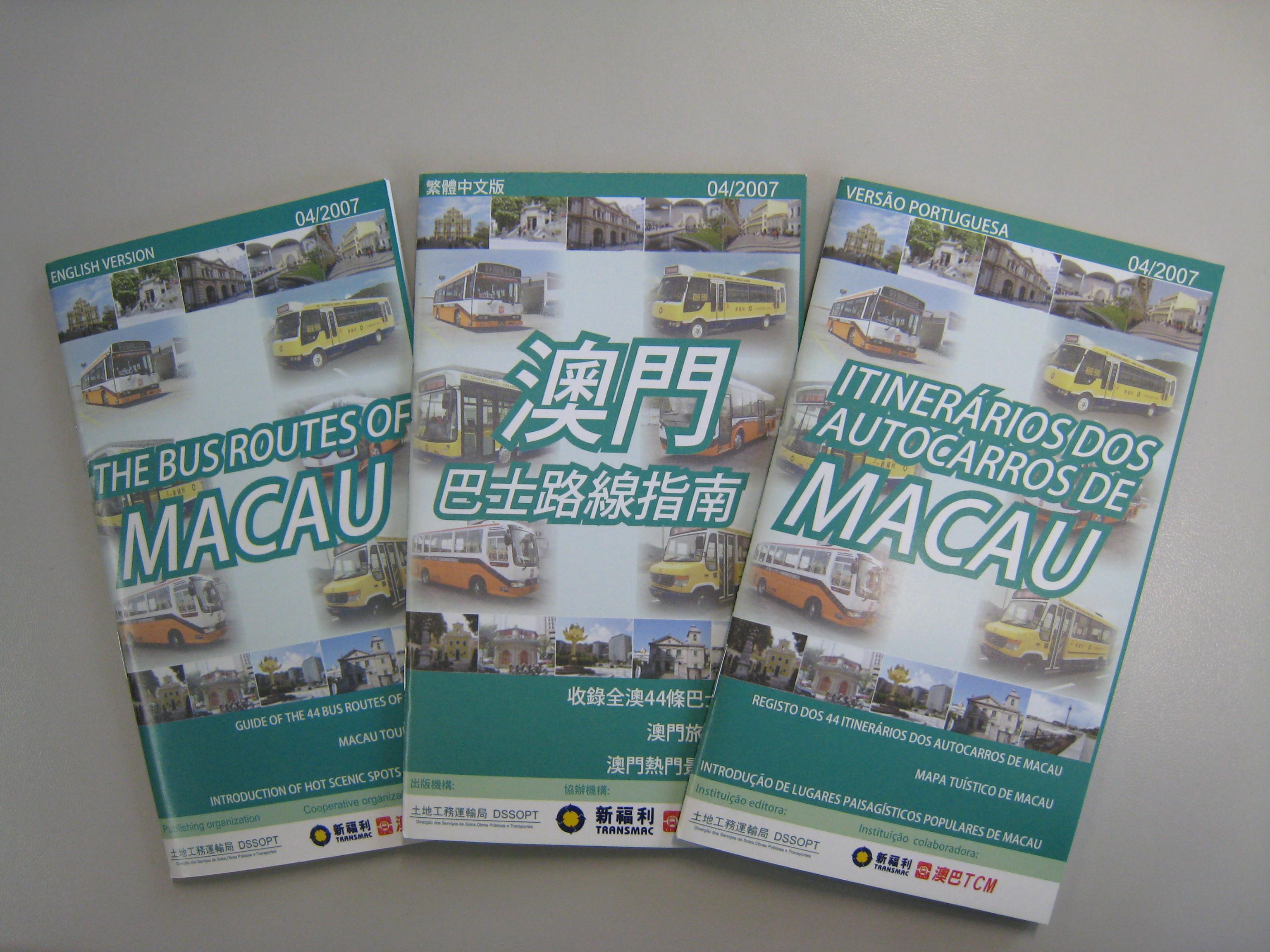 土地工務運輸局聯同兩間巴士公司修訂的新版《澳門巴士路線指南》為市民及遊客提供最新的巴士路線資訊,設計輕巧,方便攜帶。新版指南分有中、葡、英三個版本,收錄了全澳合共四十四條巴士路線,並附有一張摺合式的小型地圖,地圖內載有本澳熱門的旅遊景點資料,方便遊客查閱。