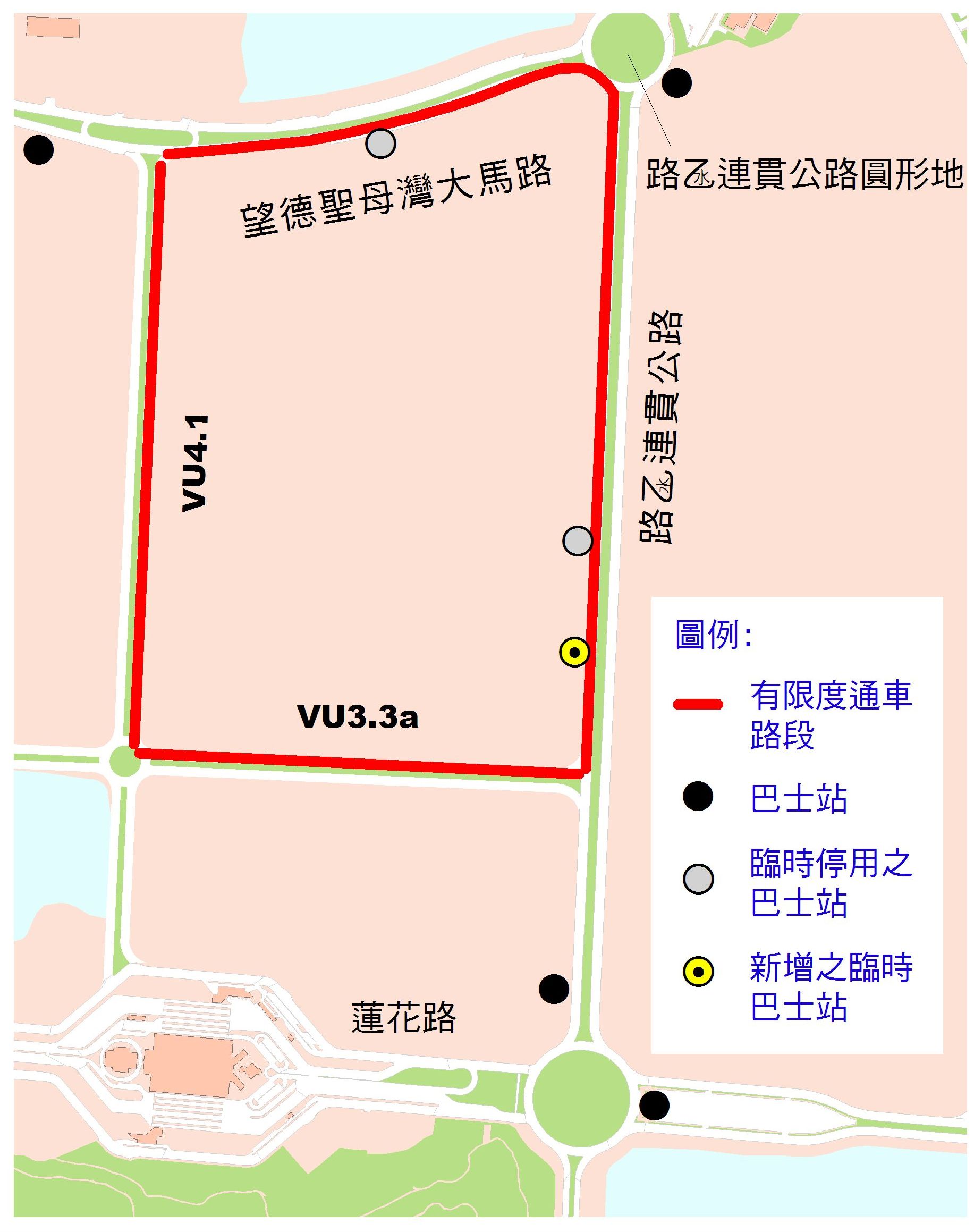 本月二十八日實施有限度通車及禁止泊車的路段,包括靠近路氹連貫公路圓形地的一段望德聖母灣大馬路和連貫公路、以及兩條新闢道路(VU4.1和VU3.3a);同日位於望德聖母灣大馬路和連貫公路的兩個巴士站暫停使用,為方便巴士乘客上落車,靠近新闢道路(VU3.3a)的連貫公路將設置臨時巴士站。途經連貫公路的六條巴士線(15、21、21A、25、26和26A)將改用該臨時巴士站,而原來在望德聖母灣大馬路巴士站上落車的乘客(25、26A、MT1和MT2),可使用下一站望德聖母灣/排角站。
