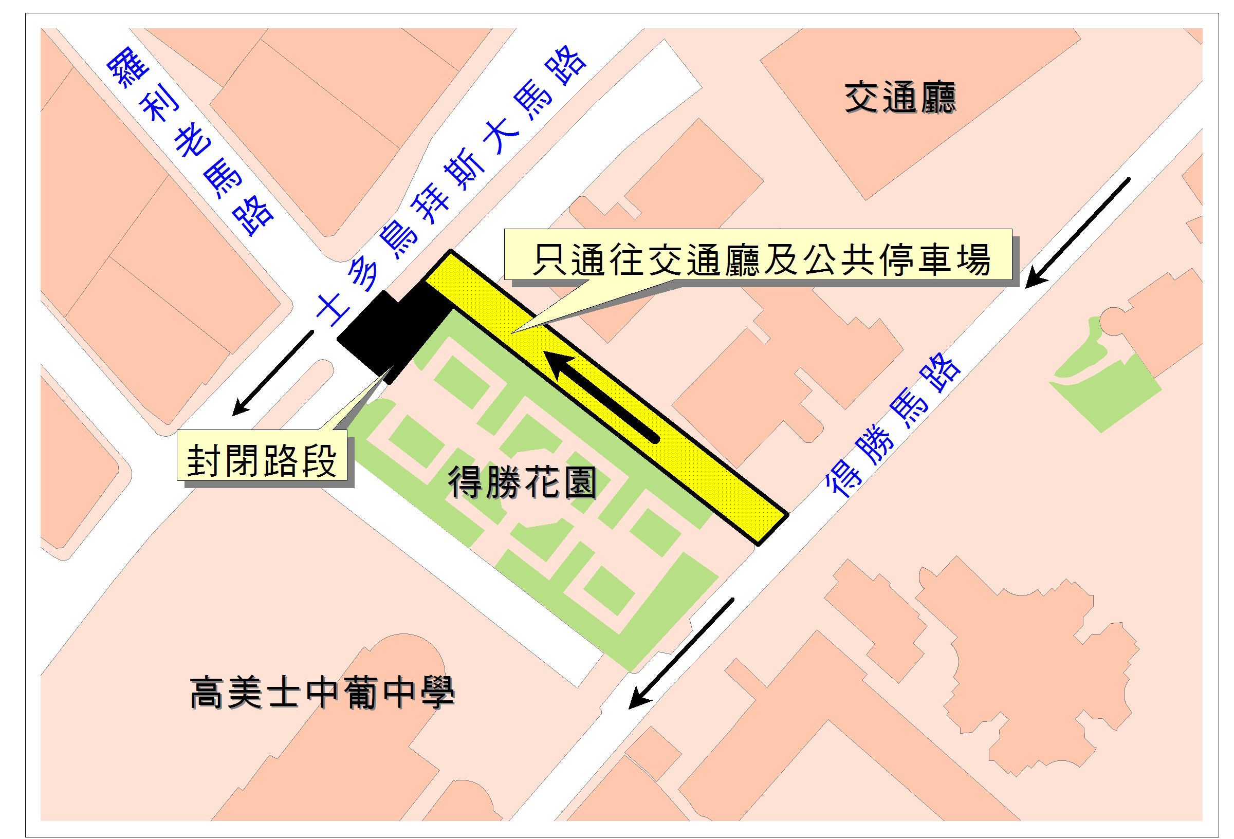 因進行下水道重整工程,介乎士多鳥拜斯大馬路與得勝花園之間的一段內路(交通廳門前路段),將於本周三(十二月十二日)上午十時起禁止通車,若需前往治安警察局交通廳及栢景停車場的車輛,可取道得勝花園側的新闢臨時道路,有關臨時措施為期約十五天。