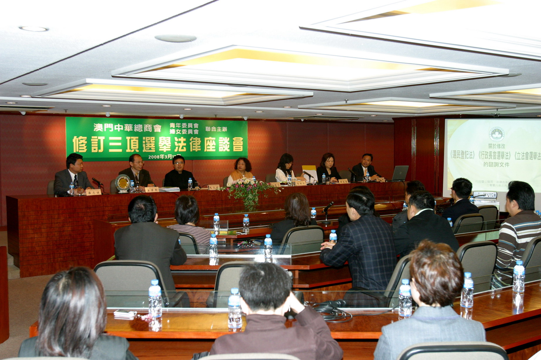 應中華總商會的邀請,行政暨公職局和法律改革辦公室今天(3月17 日星期一)晚上七時在澳門新口岸上海街175號中華總商會大廈5樓向該會的青年委員會及婦女委員會的成員講解修改《選民登記法》、《行政長官選舉法》和《立法會選舉法》諮詢文本的內容。會上行政暨公職局朱偉幹局長、法律改革辦公室朱琳琳主任和選舉技術輔助處王穎中代處長向與會者介紹文本內各項建議的具體方案,並回答與會者提出的問題。