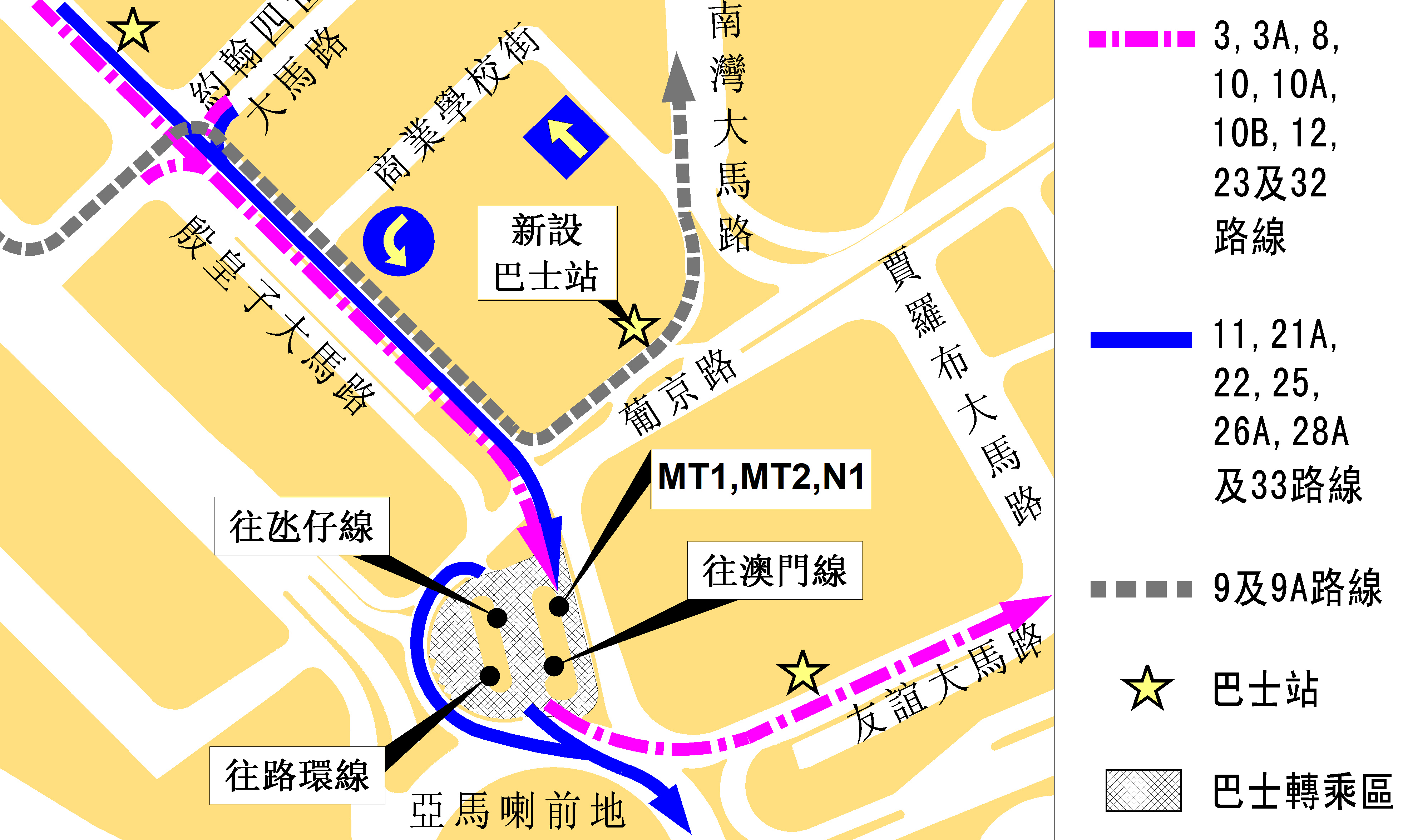 側鄰新葡京的一段殷皇子大馬路重鋪路面工程已竣工,由本周五(本月二十八日)早上十一時起,該段殷皇子馬路恢復通車,商業學校街回復原來行車方向,原來設於新葡京前的巴士站永久停用,當中十六條巴士線將由周五起正式使用亞馬喇前地轉乘區,屆時使用轉乘區的巴士線將達至十九條。