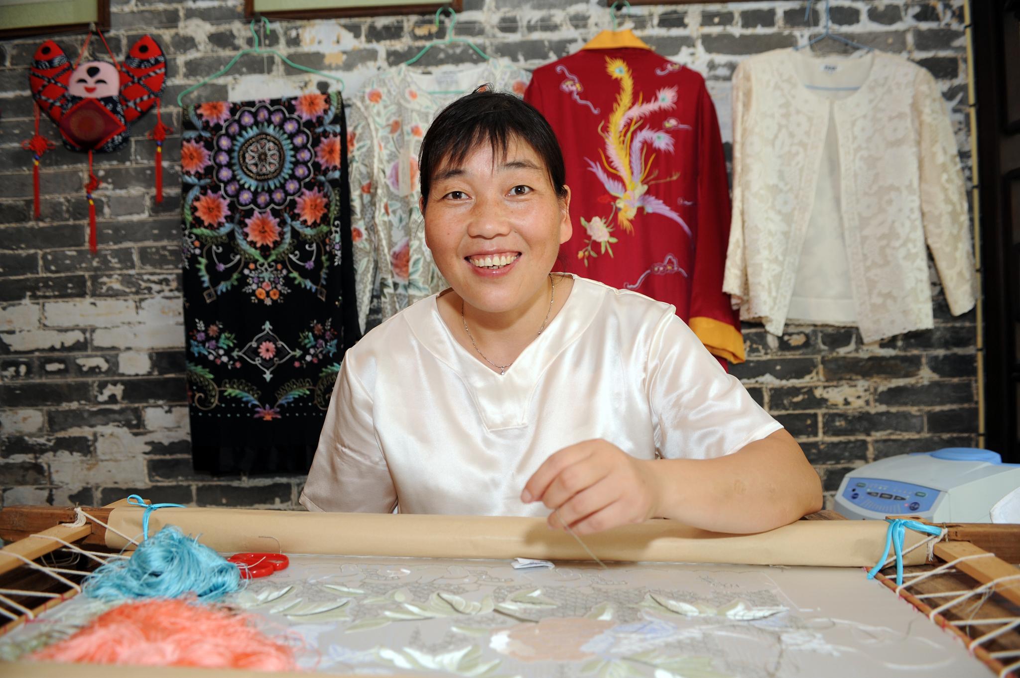 現場另一項展演──浙江台繡,是浙江台州的布藝名產,當中的彩繪綉全雕更屬台州椒江地區獨有,這種先繡後畫 (以水彩畫的濕技法畫在繡線上),結合了刺繡、雕工 (台繡技法之一)與彩繪於一體的彩繪綉全雕技法,使作品色彩達至朦朧如月的變化,沒有換色的線痕,關鍵工藝需經十道工序才能完成,目前只有台州椒江地區才能製作,產品有手帕、披巾、睡胞等,由於技法獨特,有別於一般以彩色絲線製作的刺繡工藝,因而深受歡迎。工藝家徐招娟是彩繪綉全雕的創始人陳克先生的助手,專業從事刺繡針法和新產品試制,從藝28載,1989年成功創作了新式的貼襯長針繡技法,成為彩繪繡全雕的關鍵工藝,與陳克一同成功研創彩繪繡全雕技法。