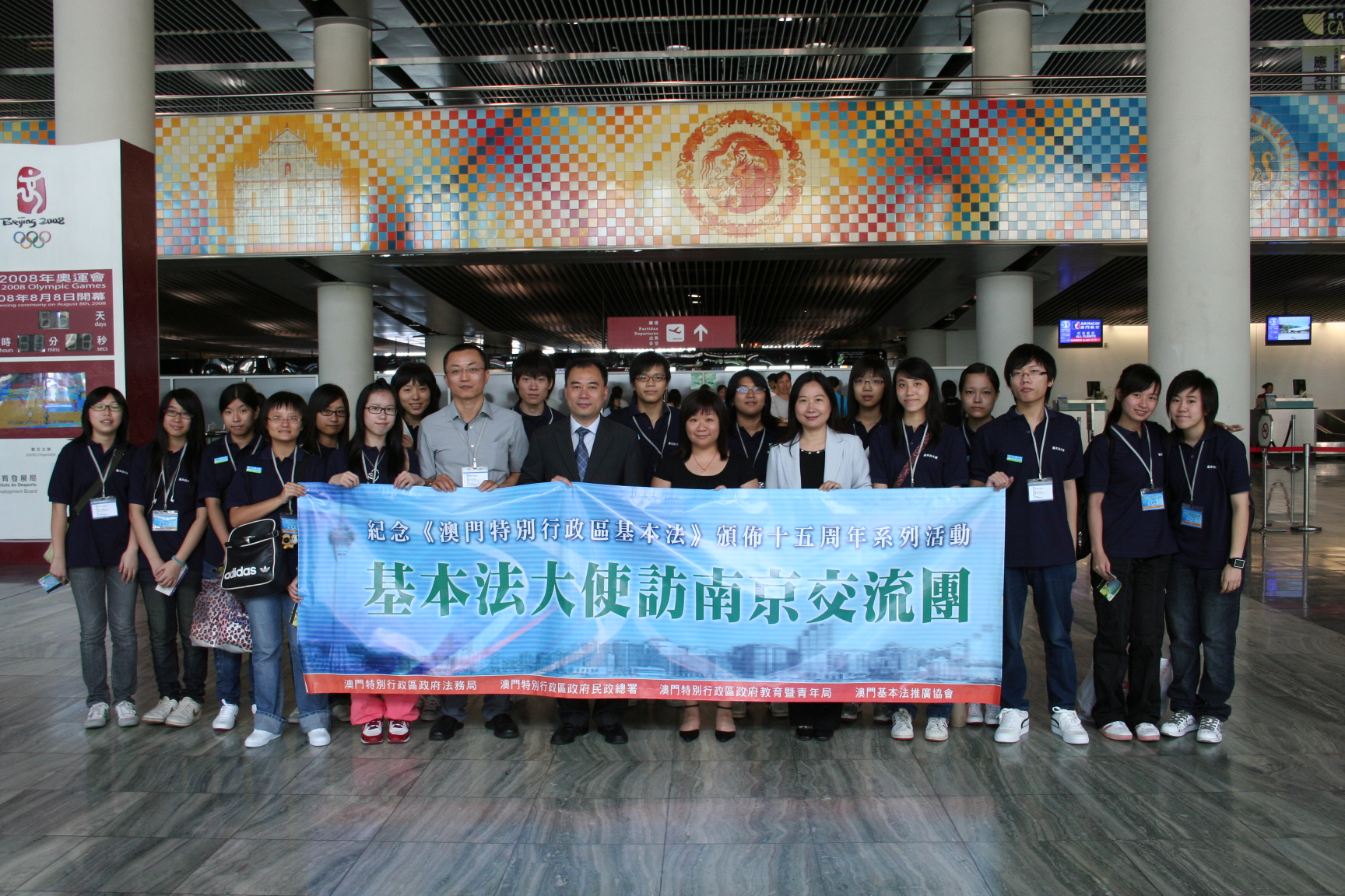 交流團昨日早上出發,法務局法律推廣廳代廳長羅靜萍、教育暨青年局的青年結社培訓暨輔導處陳旭偉處長及黑沙環青年活動中心薛鳳翹主任到機場送行,預祝本次基本法大使的南京交流活動能順利完成,團員們都能在活動中獲得豐碩的成果,並滿載而歸。