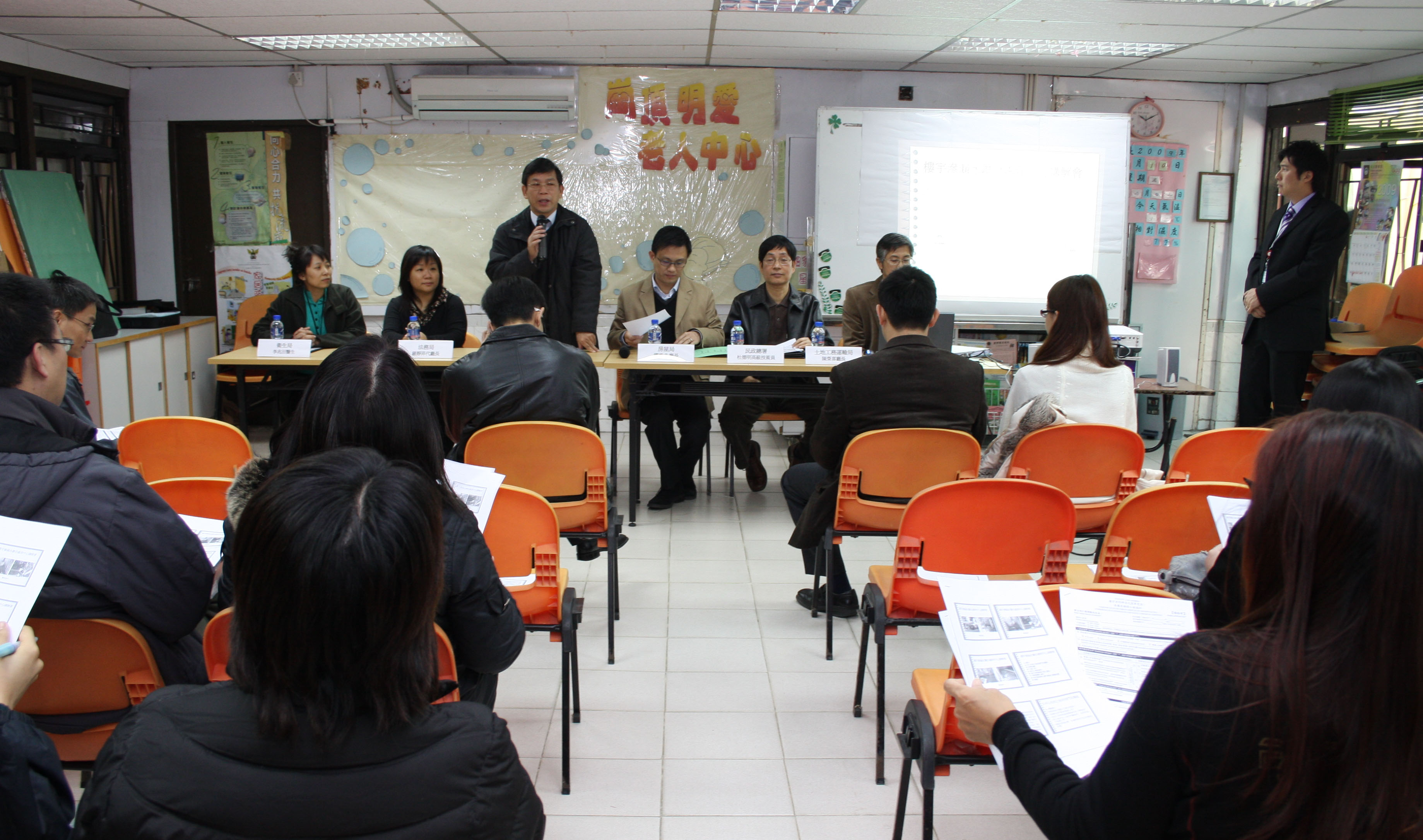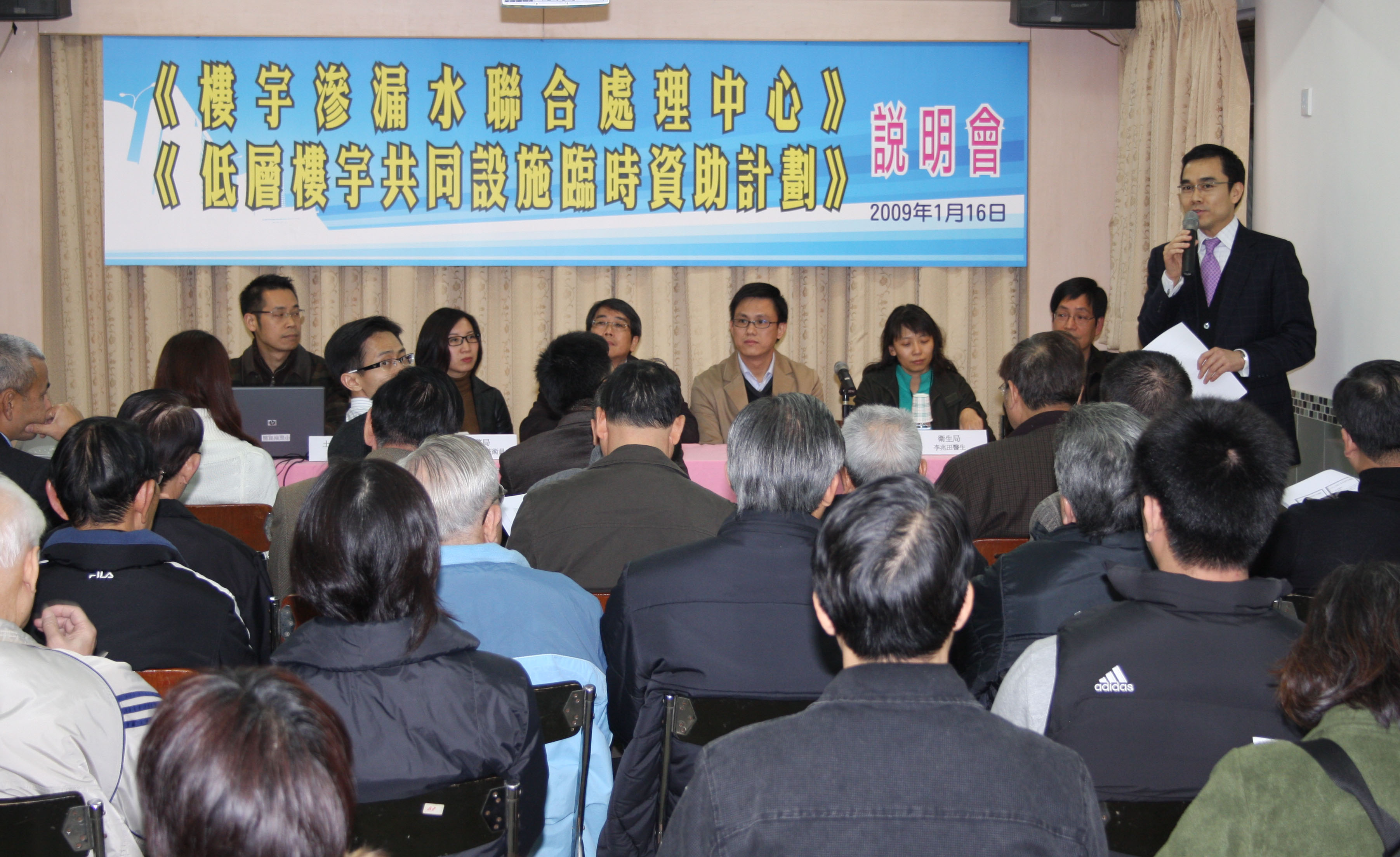 為協助居民處理樓宇塞渠滲漏的問題,以及改善樓齡30年或以上的低層樓宇進行共同部分保養的工作,政府將設立《樓宇滲漏水聯合處理中心》及推出《低層樓宇共同設施臨時資助計劃》,以改善居民居住環境,提升生活素質。房屋局於1月12日至16日聯同土地工務運輸局、民政總署、衞生局及法務局等多個政府部門先後與澳門工會聯合總會、澳門明愛及澳門街坊會聯合總會合辦《樓宇滲漏水聯合處理中心》及《低層樓宇共同設施臨時資助計劃》說明會,向社團及居民作出詳細說明,參加人數合共約一百六十多人,與會者踴躍發問,反應熱烈。