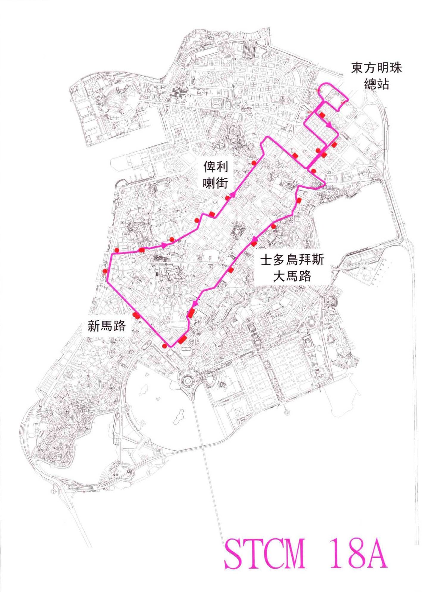 18A 東方明珠總站→勞動節大馬路→東北大馬路/廣華→東北大馬路/東華→慕拉士/飛通大廈→新雅馬路/母親會→二龍喉公園→得勝花園→愛都酒店→水坑尾/公共行政大樓→約翰四世大馬路→中區/殷皇子馬路→新馬路→內港/停車場→沙欄仔→白鴿巢前地→連勝/鏡湖醫院→連勝馬路→渡船街/俾利喇街→俾利喇/高士德→澳廣視→慕拉士巷→東北大馬路/海濱→勞動節街/中葡職業技術學校→黑沙環中街/黑沙環衛生中心→東方明珠總站