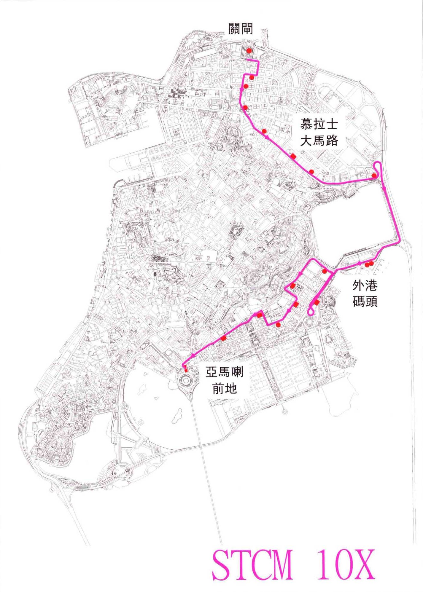 10X 關閘總站→看台街/騎士馬路→關閘馬路→關閘馬路/三角花園→慕拉士馬路→慕拉士巷→慕拉士/飛通大廈→漁翁街/水塘→外港碼頭→友誼馬路/行車天橋→羅理基/水塘→羅理基/馬六甲街→旅遊活動中心→金域酒店→東方拱門→治安警察局→亞馬喇前地