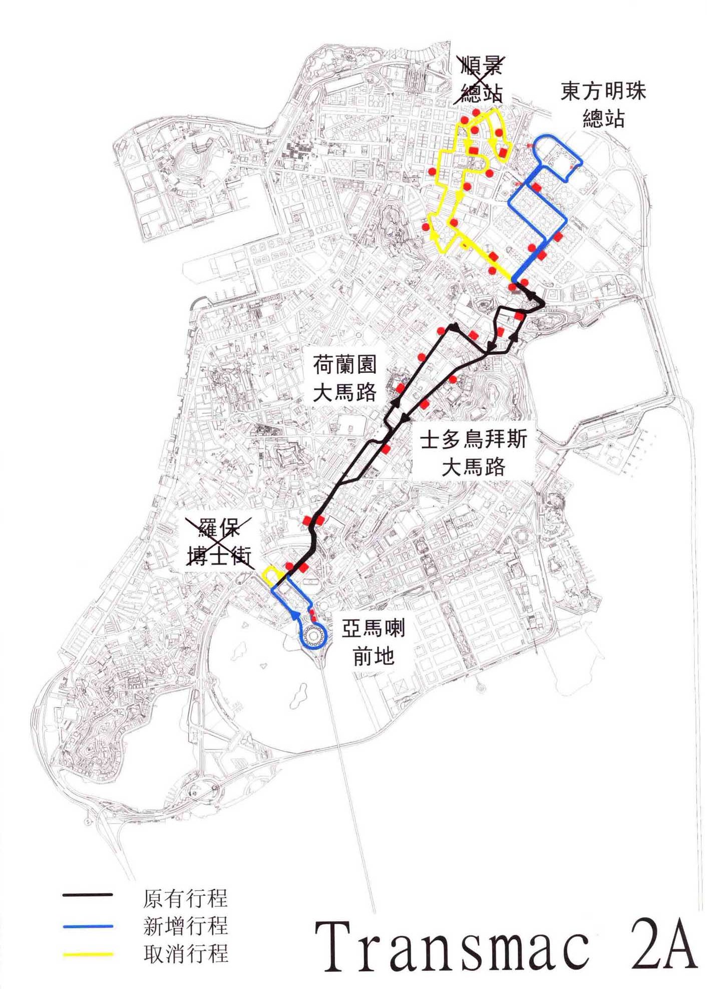 2A路線去程:東方明珠總站、勞動節大馬路、東北大馬路、慕拉士大馬路、新雅馬路、士多鳥拜斯大馬路、水坑尾街、約翰四世大馬路、亞馬喇前地。回程:亞馬喇前地、約翰四世大馬路、水坑尾街、荷蘭園大馬路、美副將大馬路、嚤囉園路、慕拉士大馬路、東北大馬路、黑沙環新街、勞動節街、黑沙環中街、東方明珠總站。班次頻率及服務時間:每15-22分鐘一班(由早上6時40分至晚上7時30分)及每24-26分鐘一班(由晚上7時30分至11時30分)。