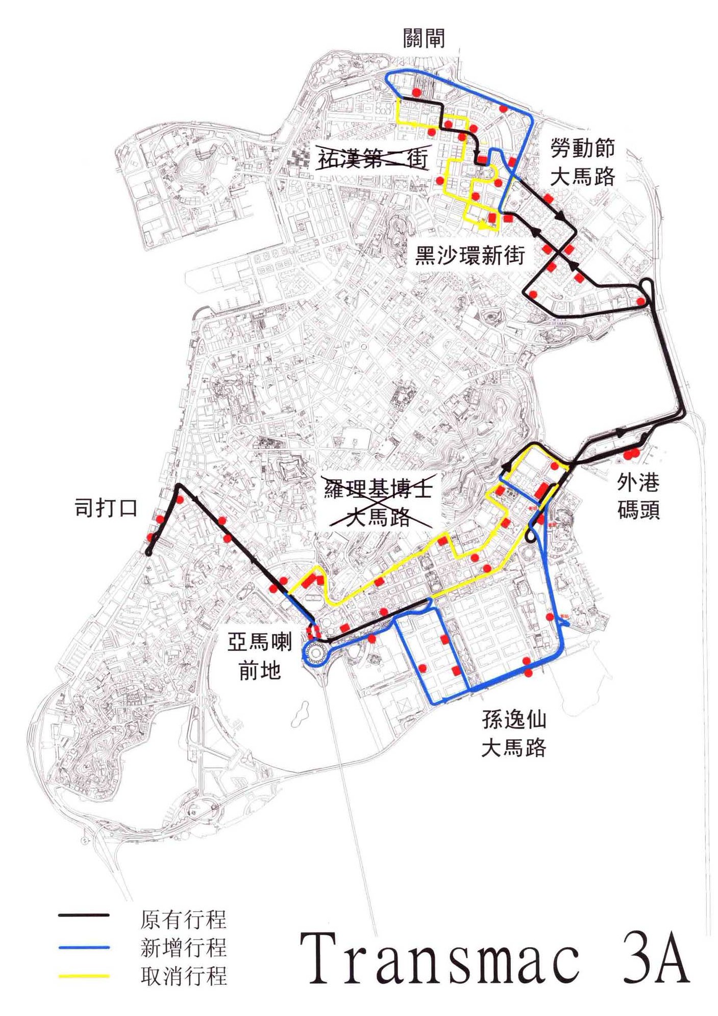 是次調整中,3A路線由關閘開出到達祐漢街市後改經菜園街往勞動節大馬路,不經永康街及高利亞海軍上將大馬路;到達外港碼頭後改經孫逸仙大馬路、宋玉生廣場、亞馬喇前地往新馬路,不經畢士達大馬路、高美士街、羅理基博士大馬路、約翰四世大馬路。由司打口開出到達置地廣場後改經城市日大馬路、孫逸仙大馬路、馬六甲街往外港碼頭,不經東方酒店、出入境事務廳前的一段友誼大馬路;到達黑沙環新街後,改經馬場東大馬路、馬場北大馬路返回關閘,不經祐漢第二街方向路段。