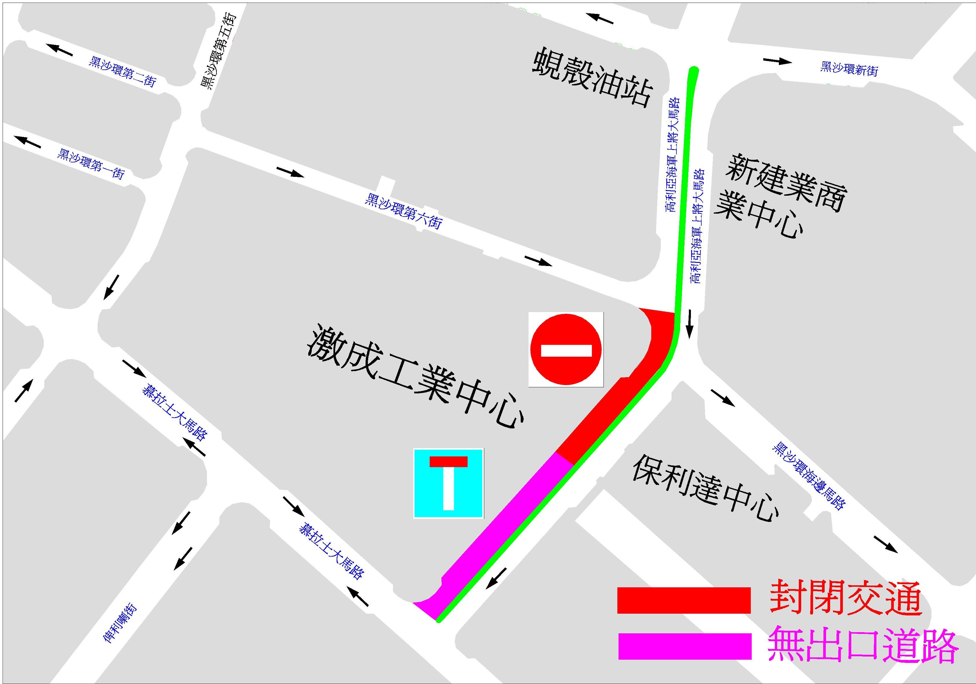 工程期間,介乎黑沙環第六街與激成工業中心之間的一段高利亞海軍上將大馬路將於本周二上午11時起封閉交通,除進出停車場的車輛外,禁止其他車輛行駛及停泊;介乎激成工業中心與慕拉士大馬路之間的一段高利亞海軍上將大馬路將成為無出口道路。上述交通改動為期35天,待該段工程完成後,將恢復原來的交通運作。交通事務局呼籲駕駛者遵守路上所設置的臨時交通標誌,並服從交通警員指揮。