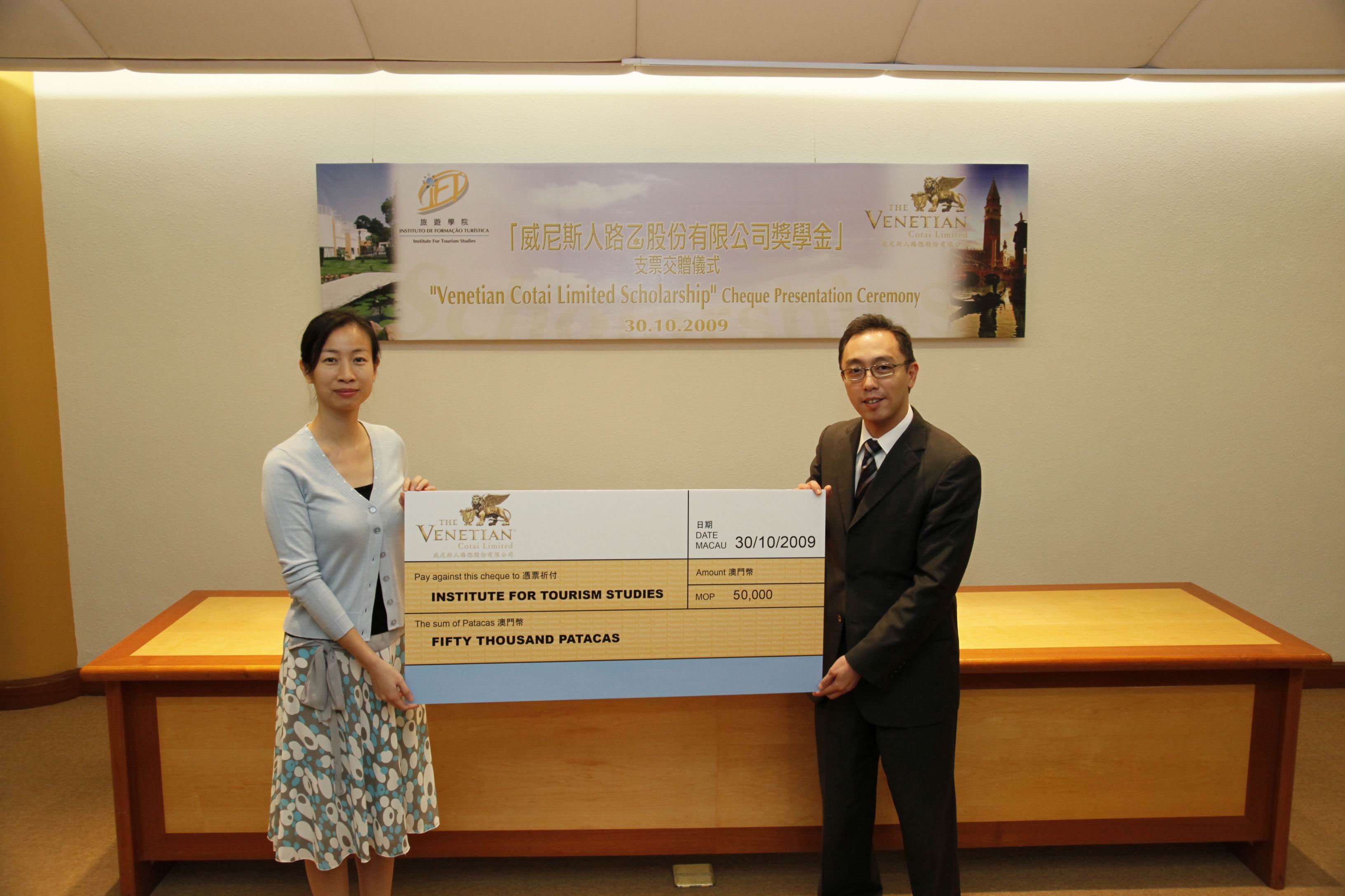 自2006/07學年,在威尼斯人路氹股份有限公司的支持下,旅遊學院設立「威尼斯人路氹股份有限公司」獎學金,以獎勵參與交換生計劃且取得優異成績的學生。本年度獎學金的支票交贈儀式於10月30日於旅遊學院舉行,由威尼斯人澳門股份有限公司人力資源行政總監陳添棣先生交贈澳門幣五萬元支票予旅遊學院,由黃竹君院長代表接受。該獎學金將於11月4日之畢業典禮上頒受予五名本澳學生。