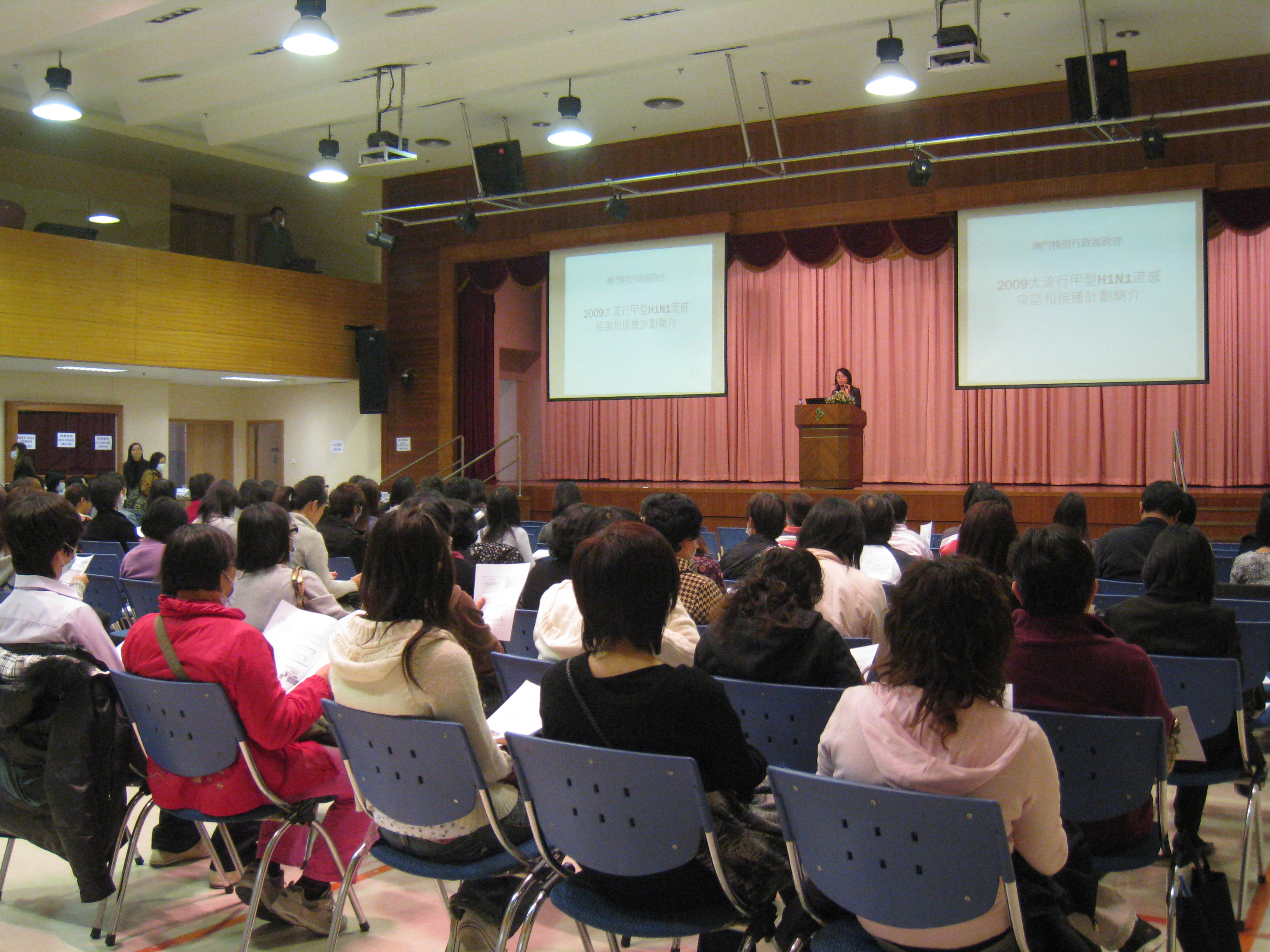 社會工作局與衛生局合辦“甲型H1N1流感疫苗和接種計劃”簡介會,日前(本月24日)一連三場於鏡湖醫院運動綜合禮堂進行,有來自全澳143間社會服務設施的前線工作人員連同本局員工約四百多人參與。