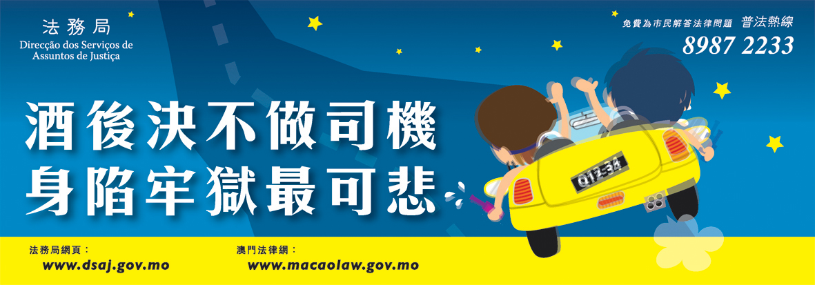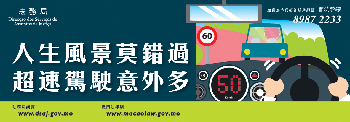 法務局為了提醒市民重視交通安全,確保行車平安,特別製作了“酒後決不做司機”及“超速駕駛意外多”等兩款精美宣傳貼紙,並張貼於本澳多間停車場,藉此向市民宣傳醉駕及超速駕駛的嚴重後果。