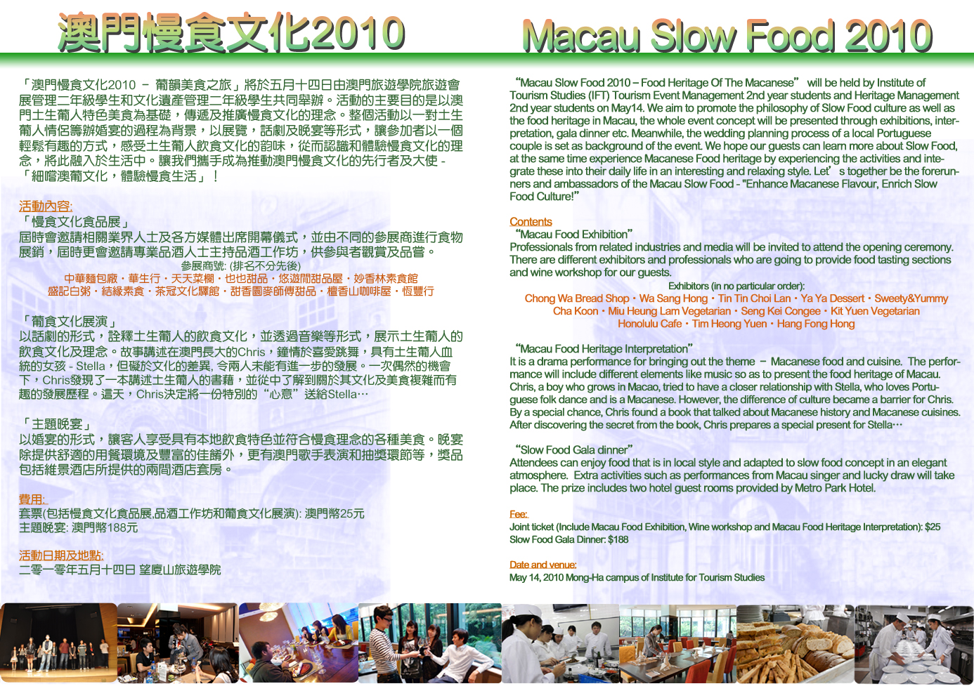 旅遊學院將於5月14日為「澳門慢食文化2010 – 葡韻美食之旅」舉行開幕儀式。是次活動由學院旅遊會展及節目管理和文化遺產管理二年級學生籌辦,旅遊學院學生會協辦。主要目的是以澳門土生葡人特色美食為基礎,向大眾推廣慢食文化的理念。