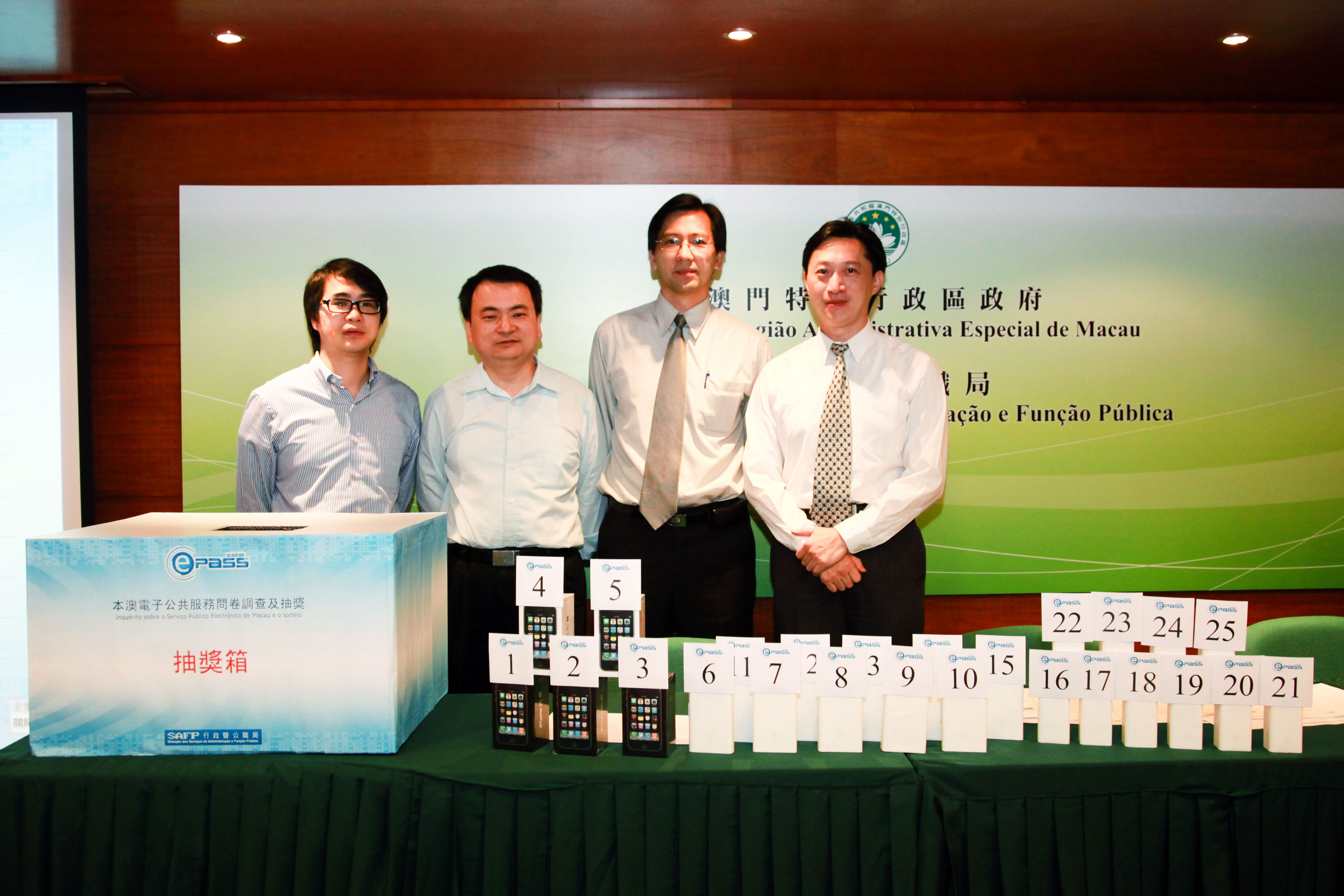 本次調查活動市民參與十分踴躍,超過二千份網上問卷成功遞交,有關的抽獎程序已於6月14日在行政暨公職局完成,行政暨公職局副局長杜志文、衛生局組織暨電腦廳廳長梁基雄、退休基金會組織及資訊處處長羅禮堅及澳門電腦學會會長林定出席了抽獎活動,分別抽出了25名得獎者,市民可於15日起進入e辦事(ePass)專題網站http://www.gov.mo/epass 查閱得獎名單,主辦單位將安排專人通知得獎者領獎。