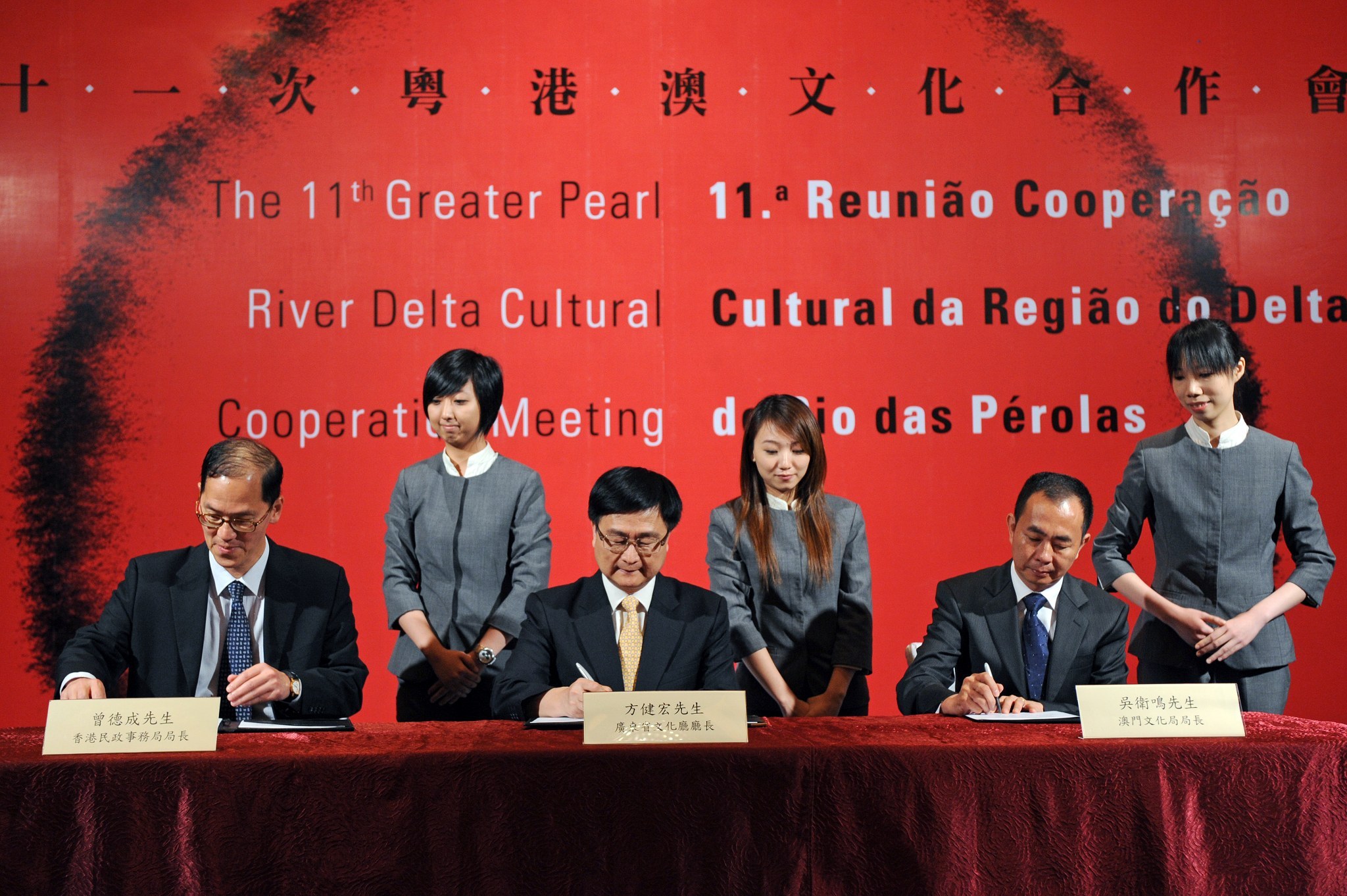 第十一次粵港澳文化合作會議於六月二十四日及二十五日在澳門召開,三地政府就六項文化合作領域作深入討論,與會代表逾百人。廣東省文化廳廳長方健宏、香港民政事務局局長曾德成、澳門文化局局長吳衛鳴,以及文化部外聯局港澳台辦公室港澳處處長李保宗、中聯辦駐澳宣傳文化部助理劉偉寧等出席會議。三地代表昨日(六月二十五日)簽署《共同開展粵港澳文化交流合作示範點工作協議書》,進一步促進和落實文化領域上的合作。