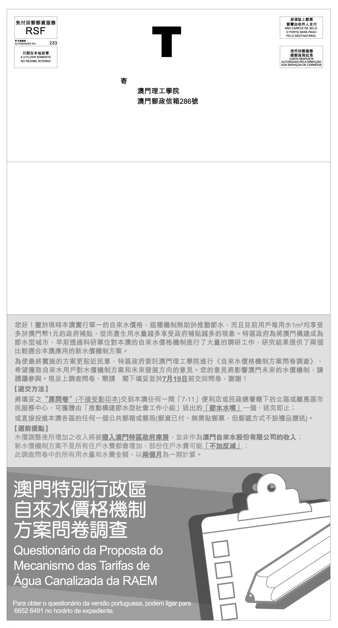 “自來水價格機制諮詢方案”諮詢期至7月30日,除是次問卷調查外,小組亦歡迎公眾透過小組網頁、電郵(water_conservation@marine.gov.mo)、傳真(28511986)或郵寄(澳門郵政信箱47號)等方式發表意見,共同為構建節水型社會貢獻力量。