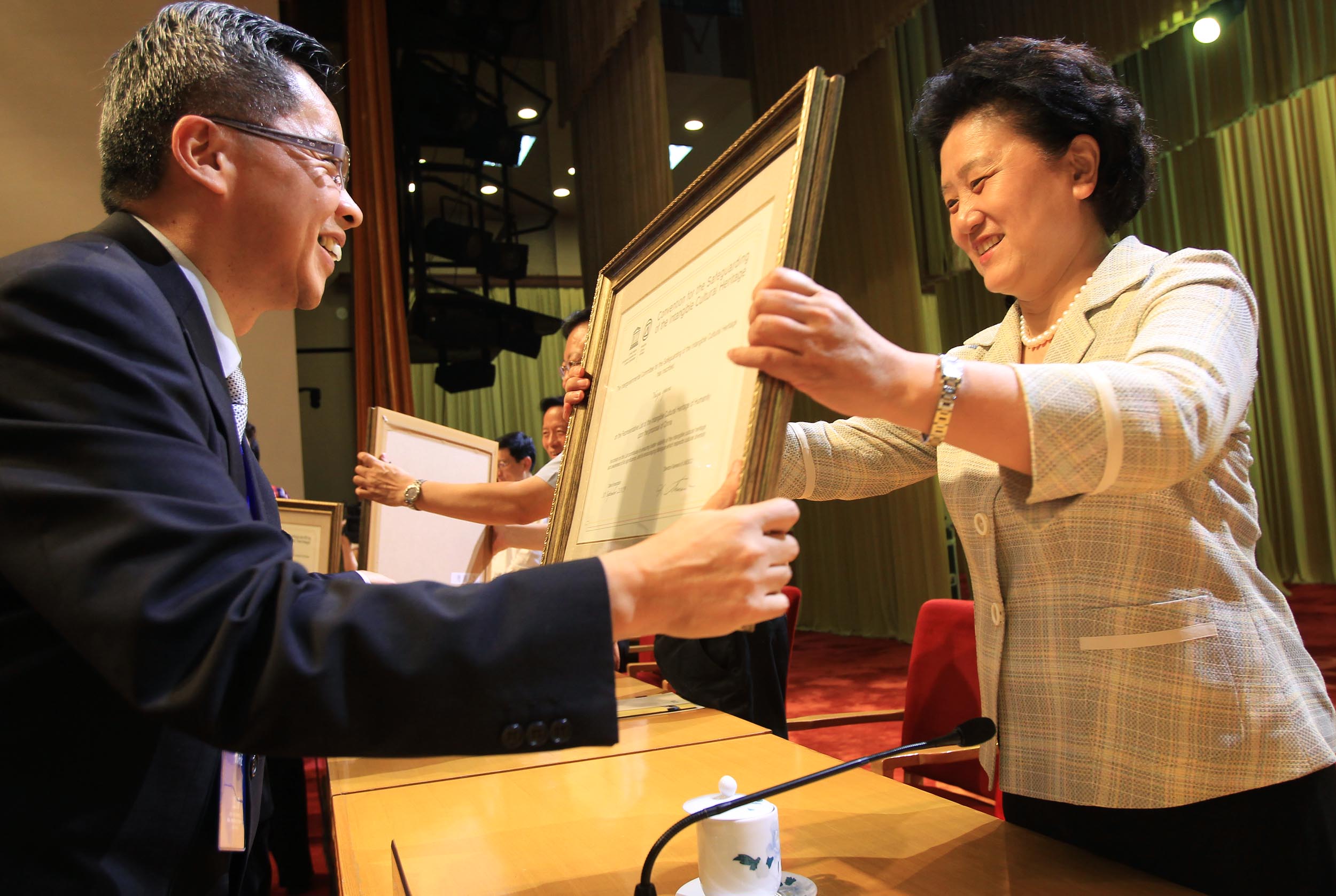 在頒發證書儀式上還進行了中國入選聯合國教科文組織非物質文化遺產名錄項目頒證儀式專場演出,包括中國朝鮮族農樂舞、花兒、瑪納斯、蒙古族長調民歌與呼麥、侗族大歌、粵劇6個項目進行表演,受到與會者熱烈歡迎。