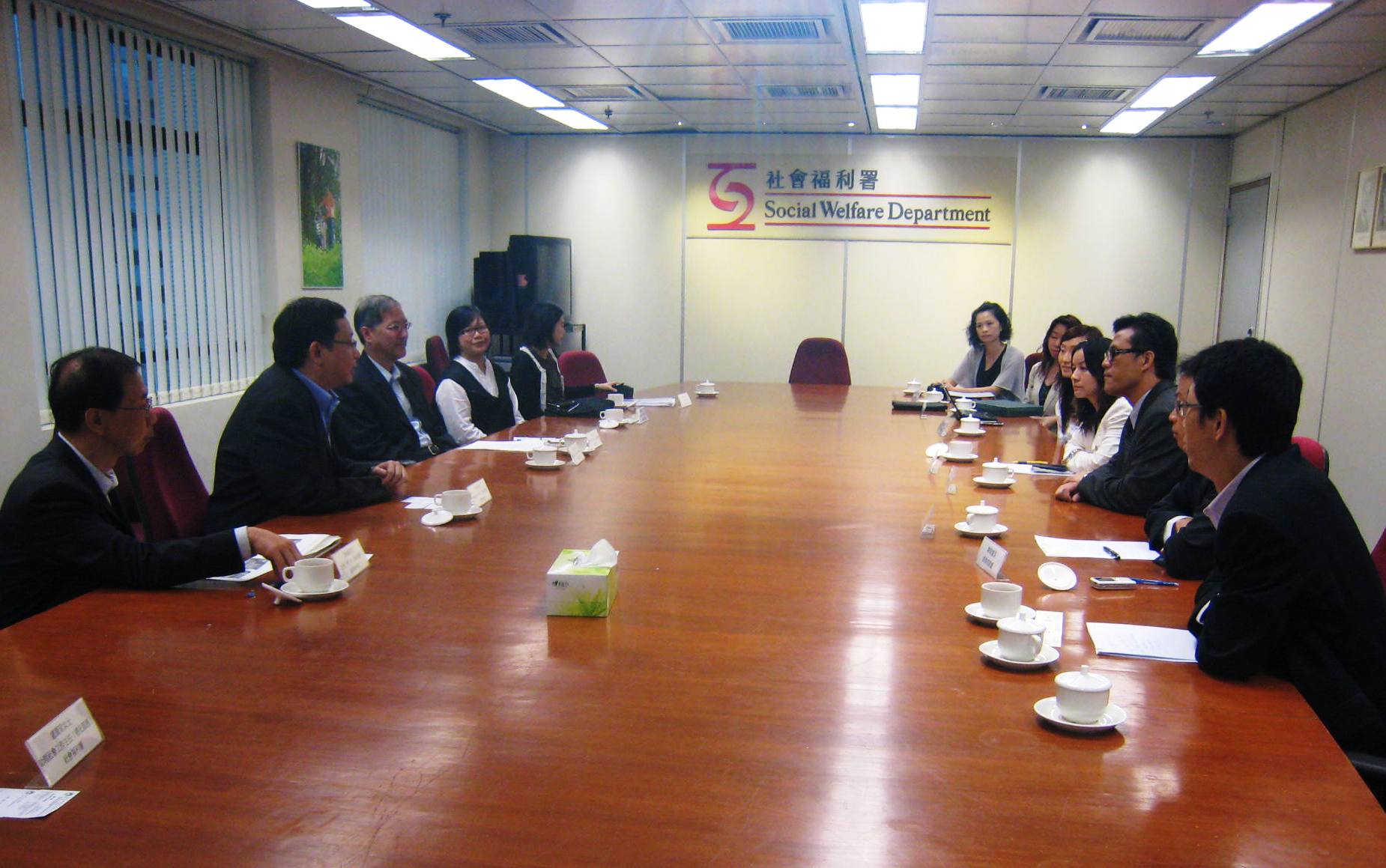 一行人抵港後首先拜訪香港特區政府社會福利署,與負責感化服務的總社會工作主任陳炳昌及高級社會工作主任莫鴻鈞及吳劍鳴等進行交流。社署人員在會上簡介了香港戒毒感化制度的發展及現況。05至07年期間,2,227名青少年毒犯中,有685名被法庭判以接受感化,657人由懲教署執行扣押刑罰,反映感化令是重要的判到選擇之一。社署對青少年毒犯的感化工作主要在法庭判其感化令或入住感化院後執行。感化令不得少於一至超過三年,感化主任須向受感化者提供輔導及小組服務,因應情況安排其他支援服務,包括戒毒治療、尿液測試等。期間可因應受感化者的自新動機或能力,向法院作出修改感化令的可行建議,如受感化者期間違反感化令或再次犯案,法庭有可能解除感化令,並重新量刑。2008年,推出「加強感化服務的先導計劃」,強化感化主任與司法人員間更生制度的更緊密合作關係;設立更客觀指標,方便感化主任進行專業評估,同時為青少年毒犯提供聚焦、深入及具體的服務。;法庭能更進一步參與更生過程等。另外,社署在07年將轄下六間感化/住宿院舍重置於新建的屯門兒童及青少年院,以改善服務質素及提供更完善的綜合康復訓練服務。