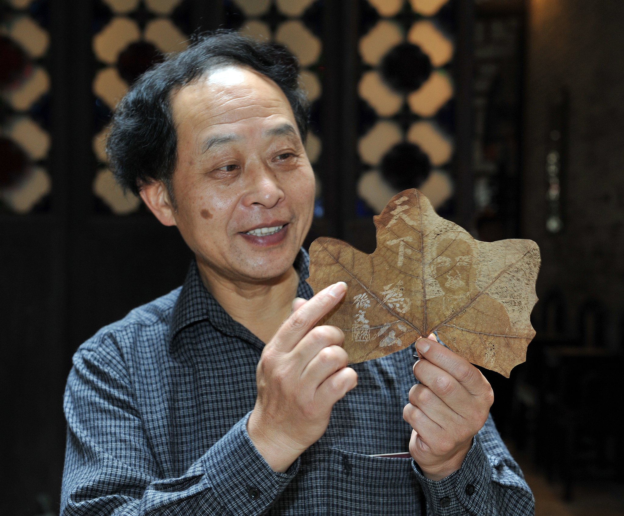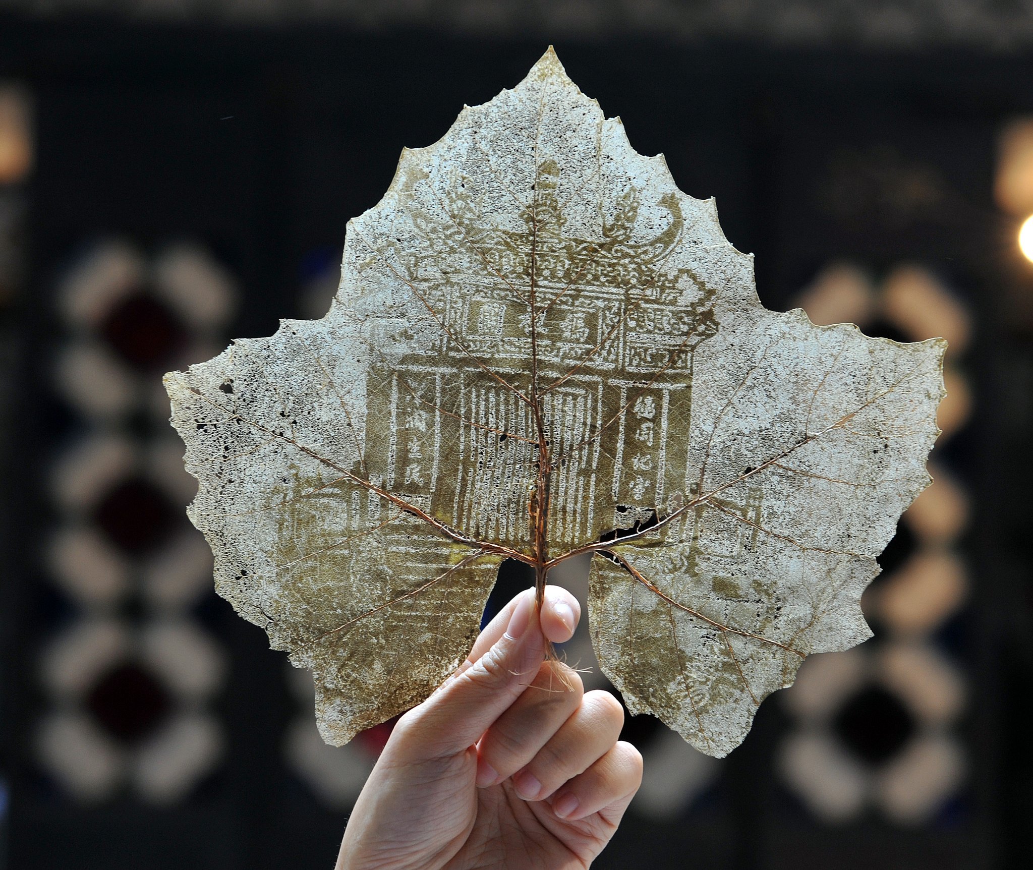 “這是一件不怕水、不怕折的藝術品。”黃太生介紹時指出,其所創作的葉雕作品均選用自然落葉,在縱橫交錯的天然葉脈上經人手雕刻而成,期間以祖傳秘製的中草藥浸泡,並經揉、發、錘等數十道工序處理而成,使葉子雖薄如蟬翼,卻柔韌度極高,不易折斷,經久不變。黃太生是江蘇泰州著名工藝家,傳承家族祖輩的葉雕技藝,再結合雕版技術、陰陽篆刻、皮影、剪紙、多維技藝於一體,作品色澤自然,古雅飄逸,一九九四年由他首創的天然葉雕藝術作品被收入「世界健力士紀錄大全」。現場多件葉雕作品中,既有風景、人物、書法等不同題材,當中更有以澳門媽閣廟為題的葉雕,作為來澳的一份獻禮,作品流露出媽閣廟的古韻風情,技藝精湛。