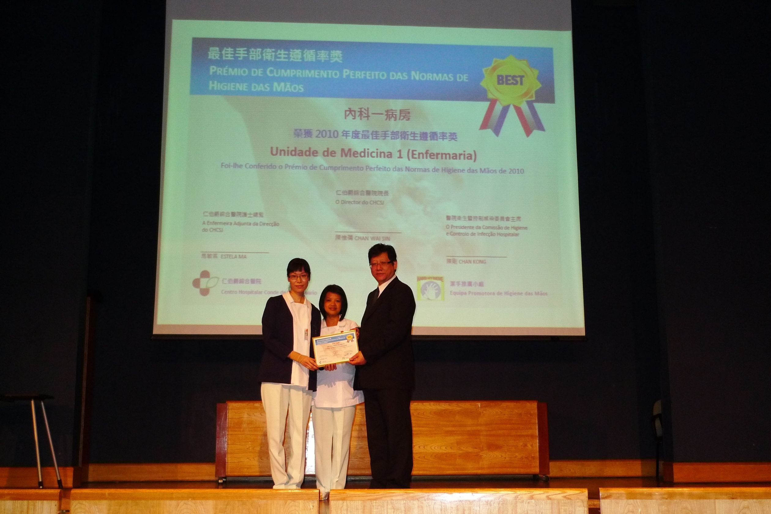潔手推廣小組組長鄭珊珊專科護士,匯報了2010年手部衛生工作的進度和各部門醫護人員潔手遵循率的調查結果,並分享小組在推行及實施手部衛生方面的策略。院方為嘉許於2010年手部衛生遵循率最佳的部門,由衛生局代局長陳惟蒨醫生向該部門頒發獎狀以茲鼓勵。護士總監馬敏燕在活動中,向七名擔任手部衛生觀察員的澳門理工學院高等衛生學校應届畢業護生,頒發「手部衛生觀察員」證書並嘉許他們工作的努力與認真。同時,她亦感謝衛生局領導在手部衛生設施和政策上充分體現出對手部衛生工作的大力支持;並亦鼓勵醫護人員共同努力繼續參與潔手運動,以降低醫療獲得性感染的機會。最後,醫院衛生暨控制感染委員會主席陳剛醫生就“醫生在推廣手部衛生的角色”發表演說,強調醫生在手部衛生推廣及實踐中角色的重要性和影響力。